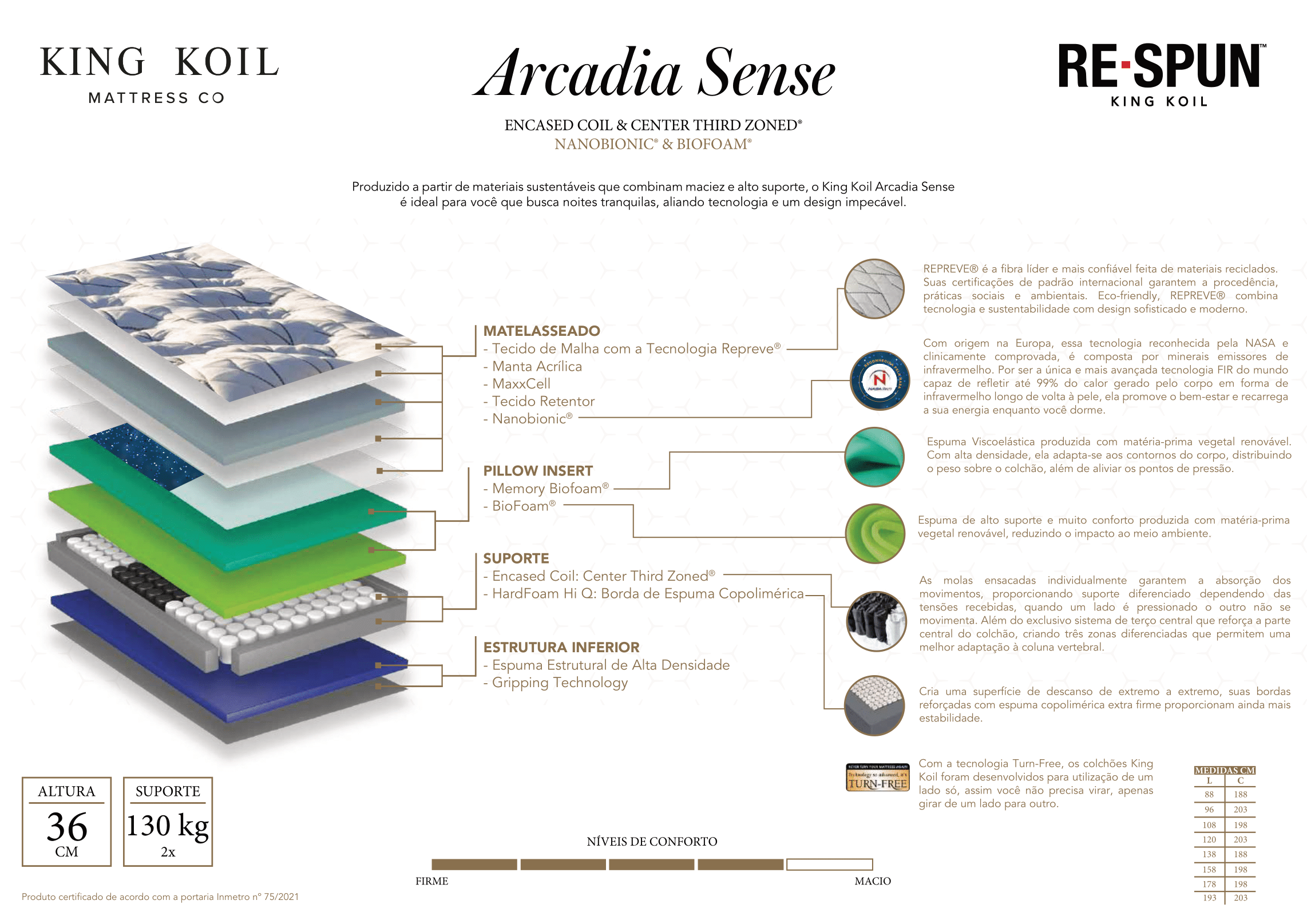 - Turn-Free: Elimina completamente a necessidade de virar o colchão, simplificando a manutenção e garantindo a consistência do conforto e do suporte ao longo do tempo.