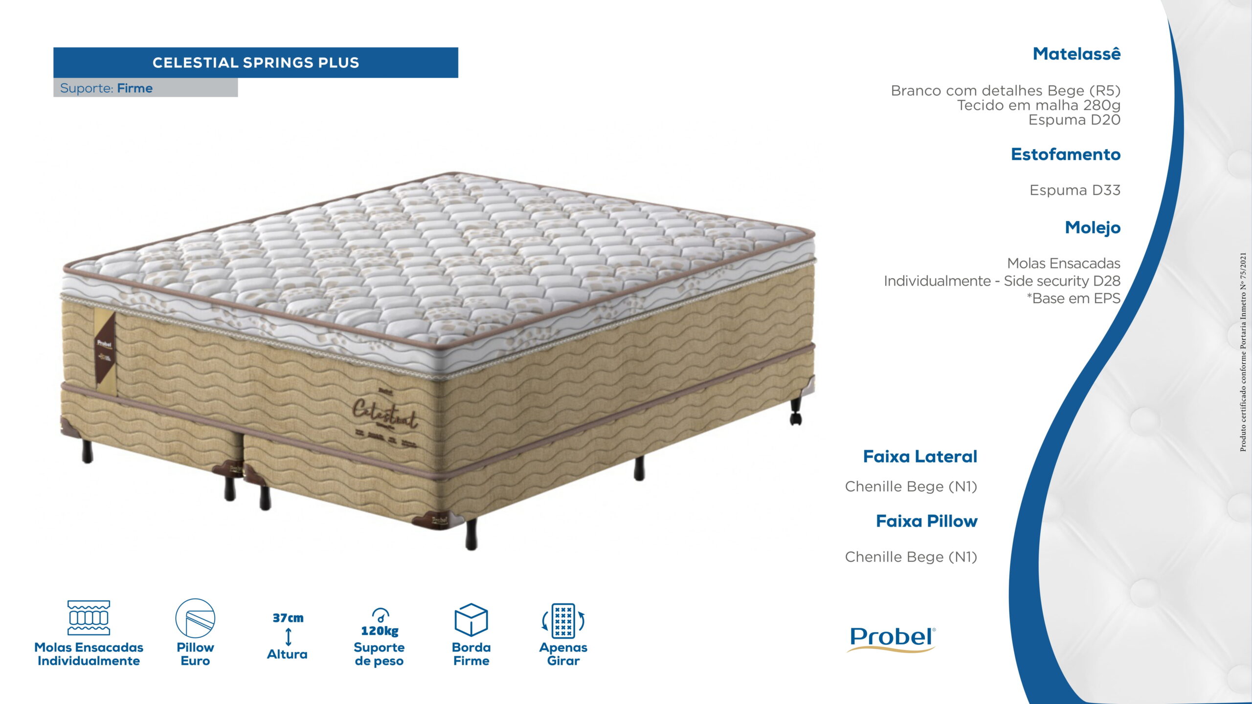 O colchão Probel Celestial Springs Plus tem molas ensacadas, que se ajustam ao seu corpo. As molas ensacadas individualmente minimizam a transferência de movimento. Uma pessoa que se move não incomoda a outra. A espuma tem densidade D33. O tecido de revestimento é de malha. O colchão também tem um tratamento contra ácaros e fungos. O suporte de peso é de 120 kg por pessoa.