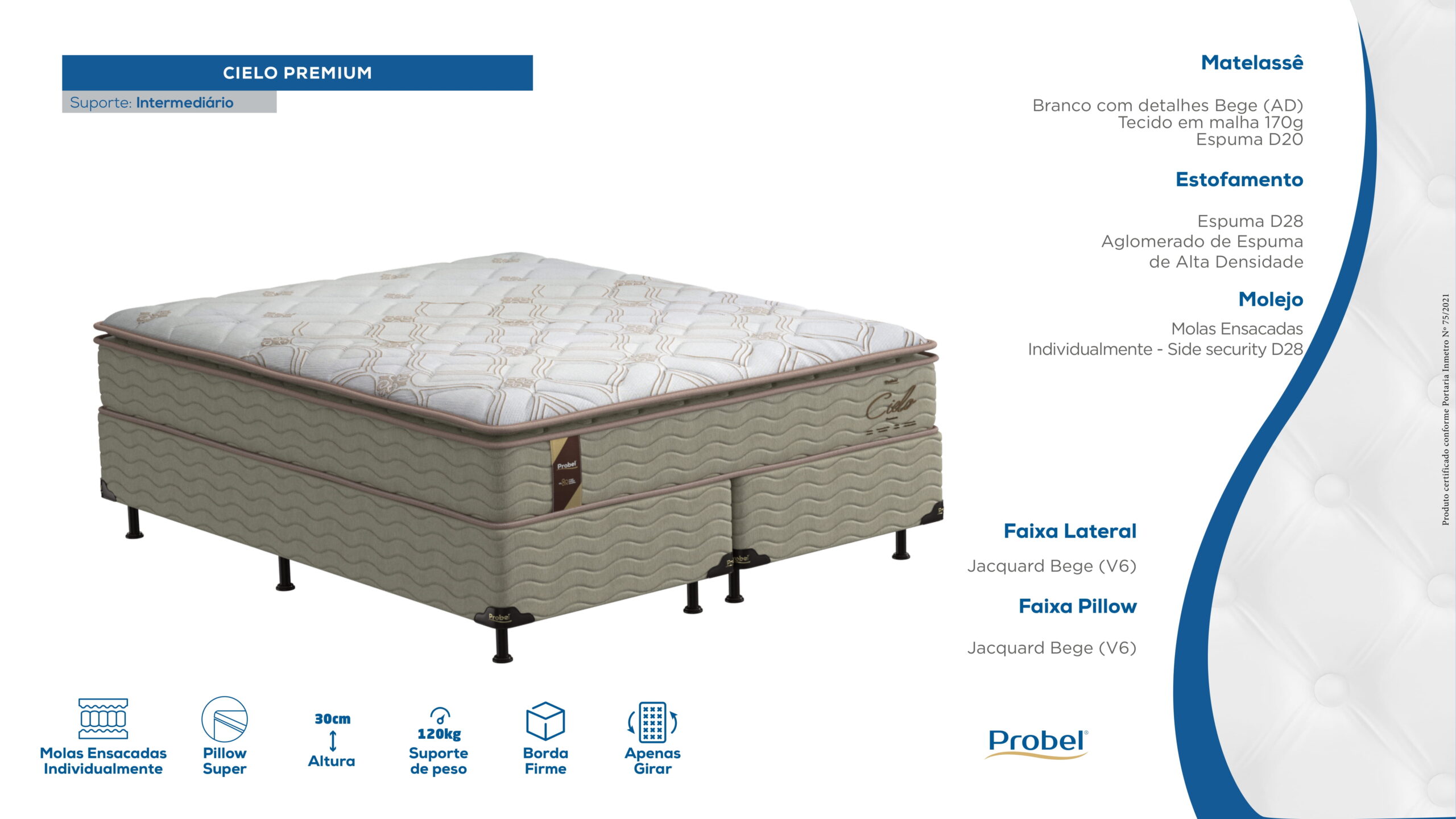 O colchão Probel Cielo Premium tem molas ensacadas, que se ajustam ao seu corpo. As molas ensacadas individualmente minimizam a transferência de movimento. Uma pessoa que se move não incomoda a outra. A espuma tem densidade D33. O tecido de revestimento é de malha. O colchão também tem um tratamento contra ácaros e fungos. O suporte de peso é de 120 kg por pessoa.