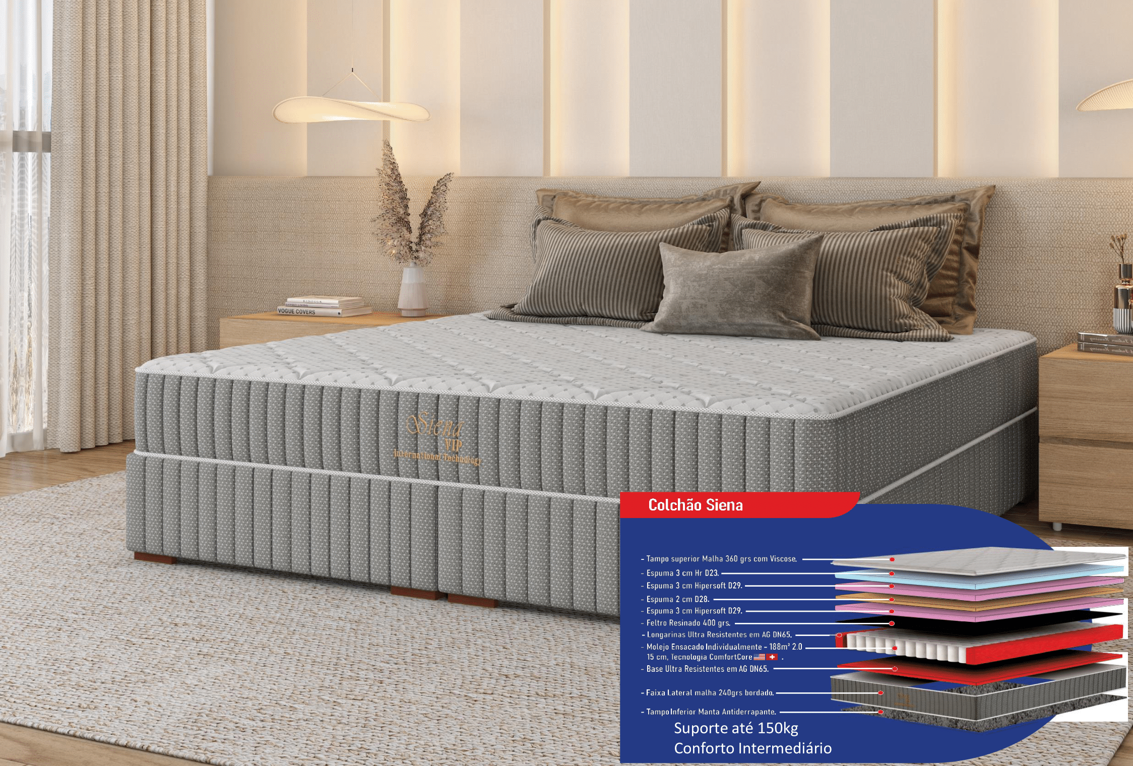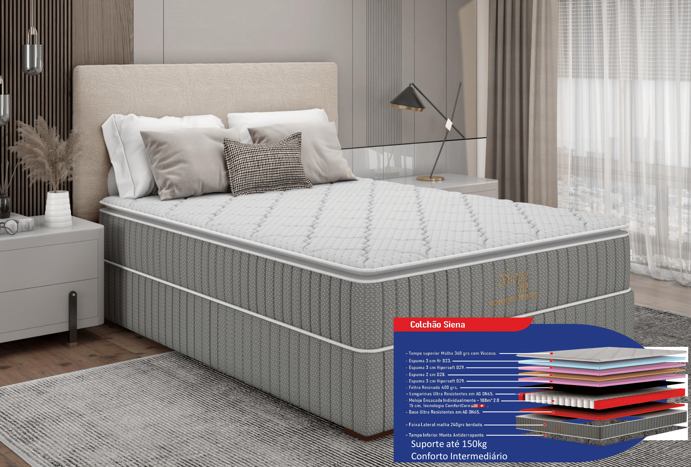 O colchão Anjos Siena tem molas ensacadas. As molas ensacadas individualmente minimizam a transferência de movimento. Uma pessoa que se move não incomoda a outra. O colchão tem um pillow top. A espuma tem densidade D28. O nível de firmeza é firme. O tecido de revestimento é de malha. O colchão tem um tratamento contra ácaros e fungos. O suporte de peso é de 100 kg por pessoa.