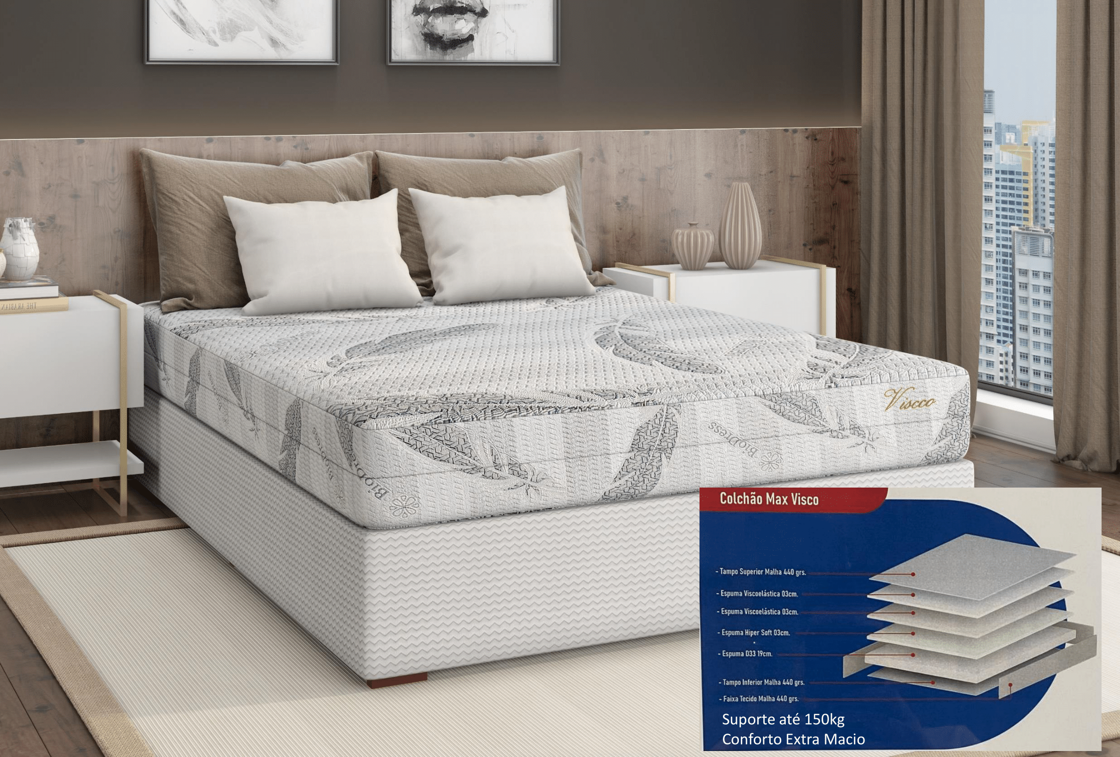 O colchão Restonic Max Visco tem molas Superlastic. Este sistema de molas de fio contínuo fornece suporte e se ajusta ao corpo. A superfície tem camadas de espuma viscoelástica e espuma Hypersoft. O nível de firmeza é firme. O colchão tem tratamento anti-ácaro, anti-fungo e anti-bactéria.