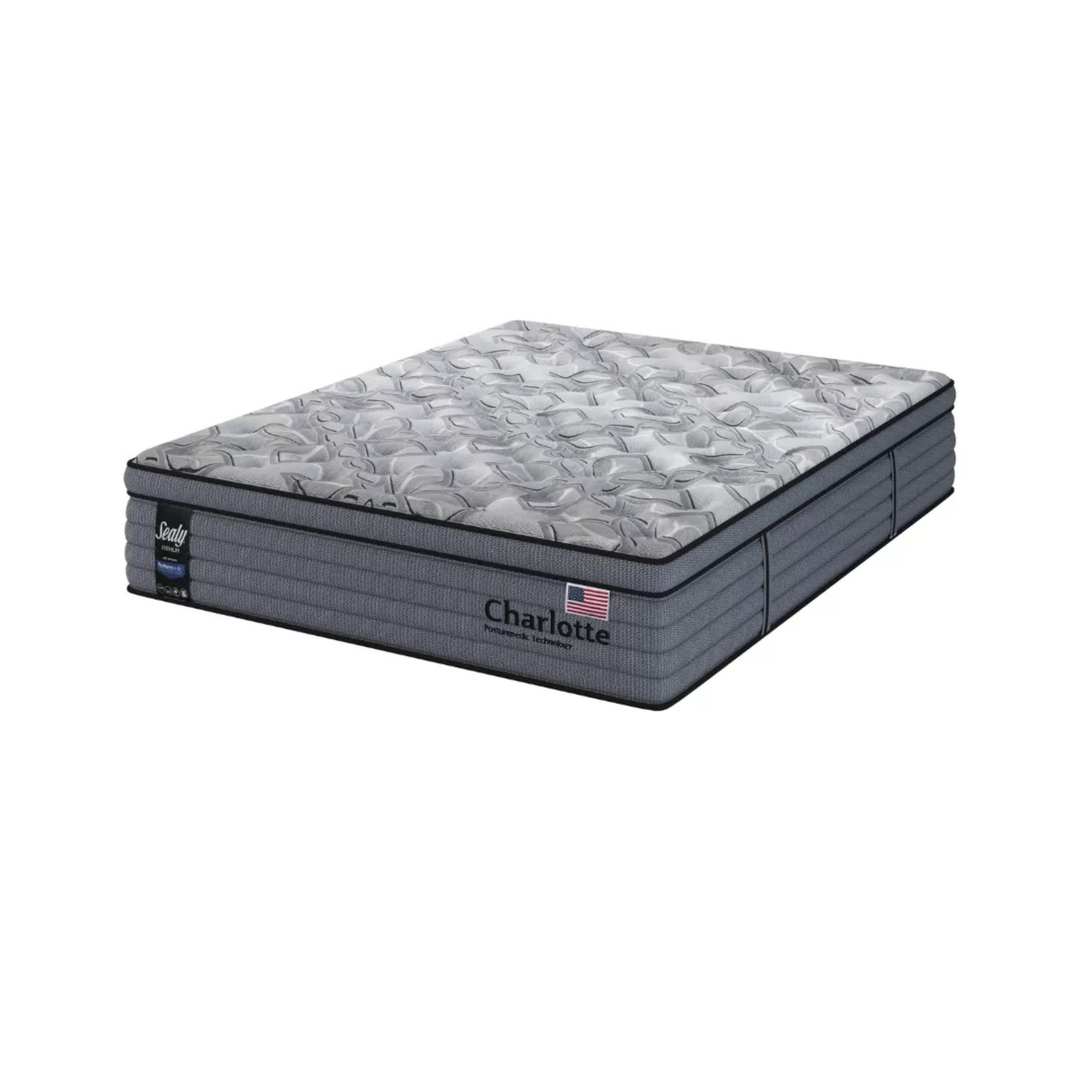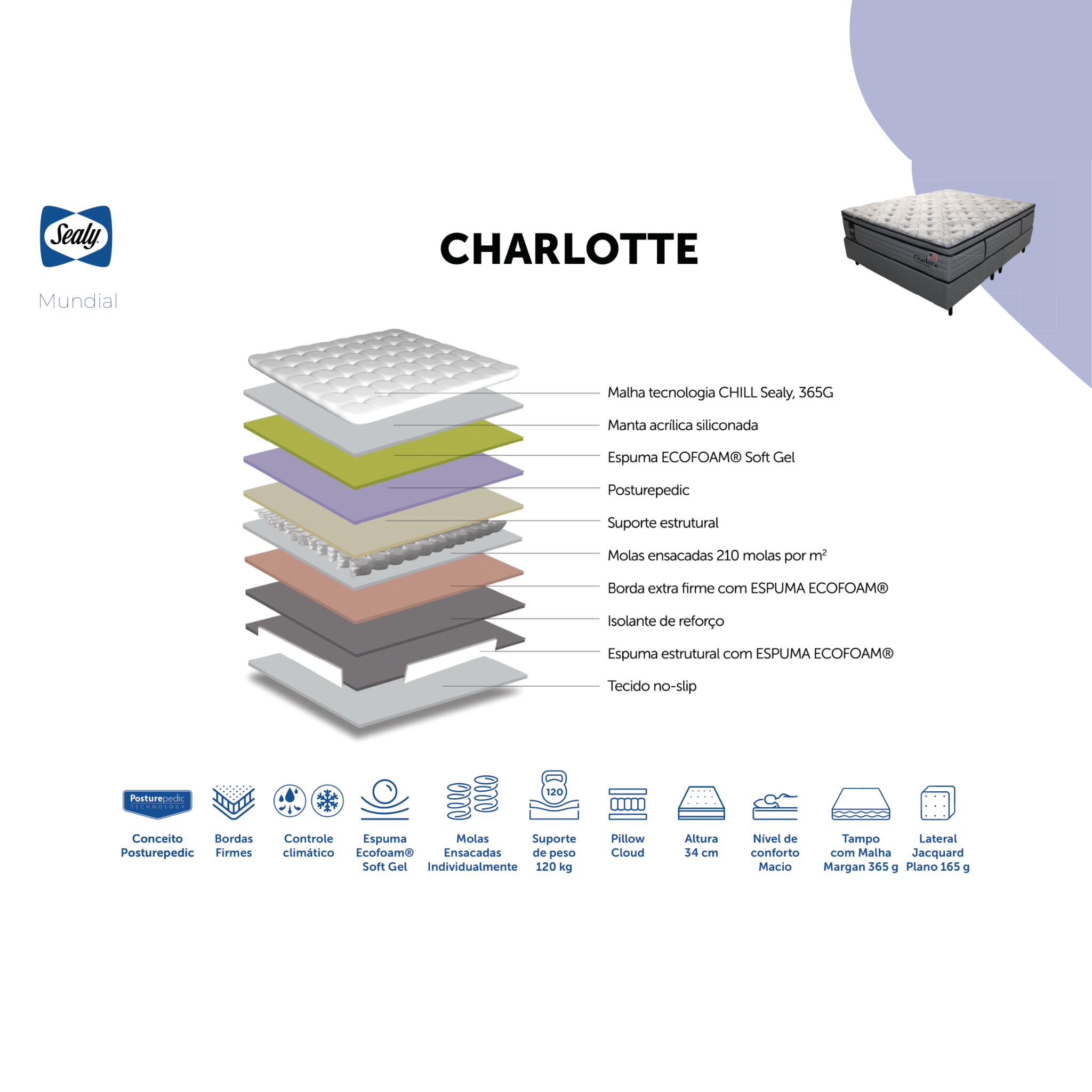 O colchão Charlotte Sealy tem a tecnologia Posturepedic. Ela dá suporte extra às áreas de maior pressão do corpo. As molas ensacadas individualmente minimizam o movimento. O colchão tem uma camada extra de espuma, a Polyframe, nas laterais. O tampo é de malha. As laterais são de tecido jacquard. O colchão tem tratamento antiácaro e antifungo. A altura é de 34 cm. O colchão suporta até 120 kg por pessoa ou 240 kg no total. Ele usa o sistema No Turn One-Side. Você não precisa virar o colchão.