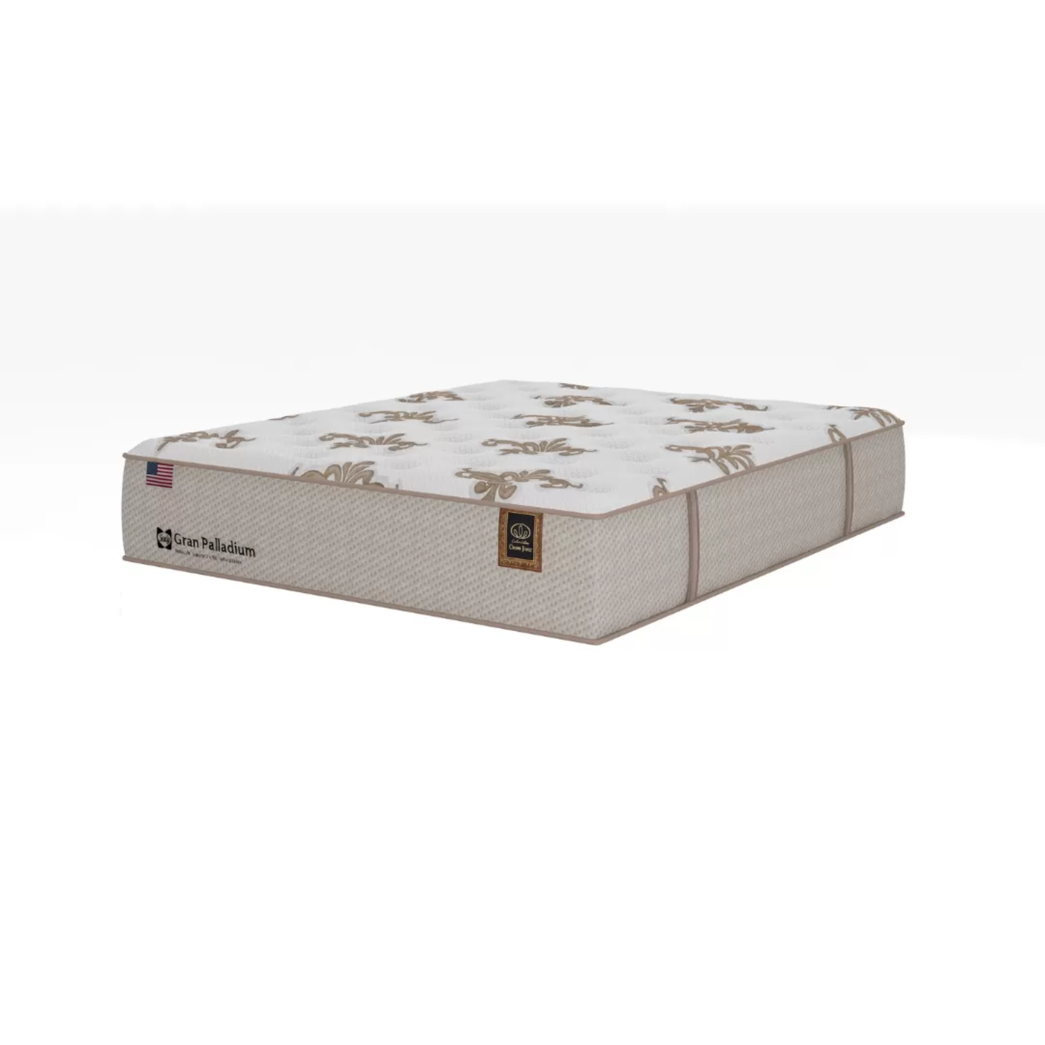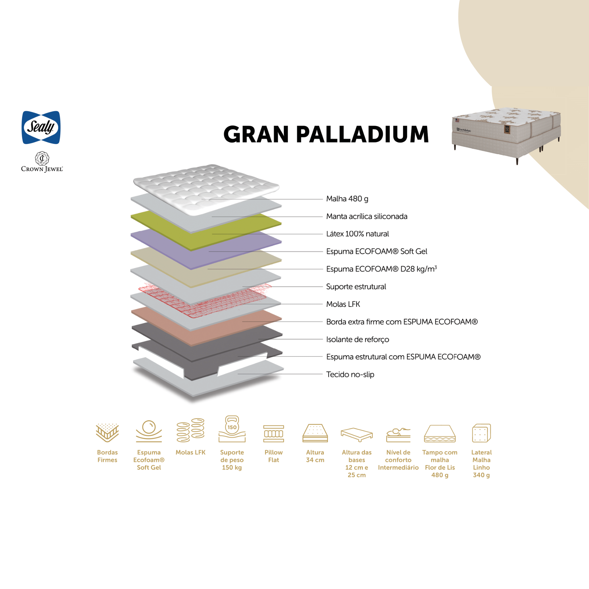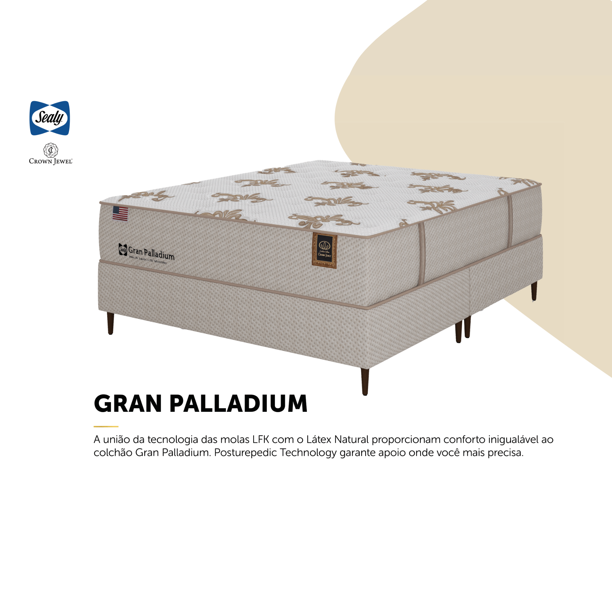 O colchão Sealy Gran Palladium tem molas LFK e látex natural. Ele tem 34 cm de altura. As molas LFK oferecem um suporte uniforme. A tecnologia Posturepedic ajusta-se às áreas de maior pressão. O látex natural é responsivo e hipoalergênico. A camada de conforto tem espumas Soft e Látex Natural, além de espuma D28. O tampo é de malha. A lateral tem malha linho. O colchão tem bordas reforçadas para durabilidade. Ele suporta até 150 kg por pessoa.