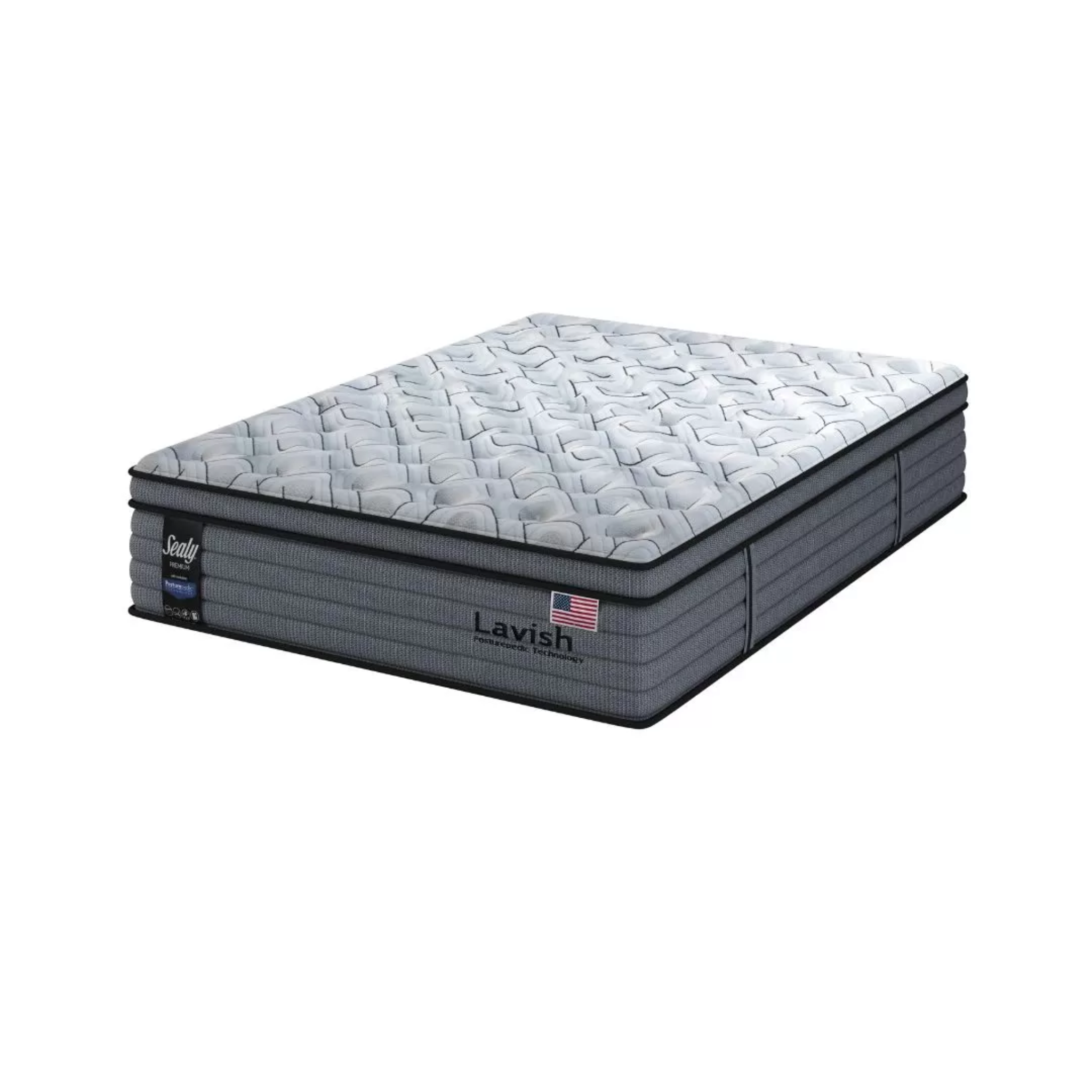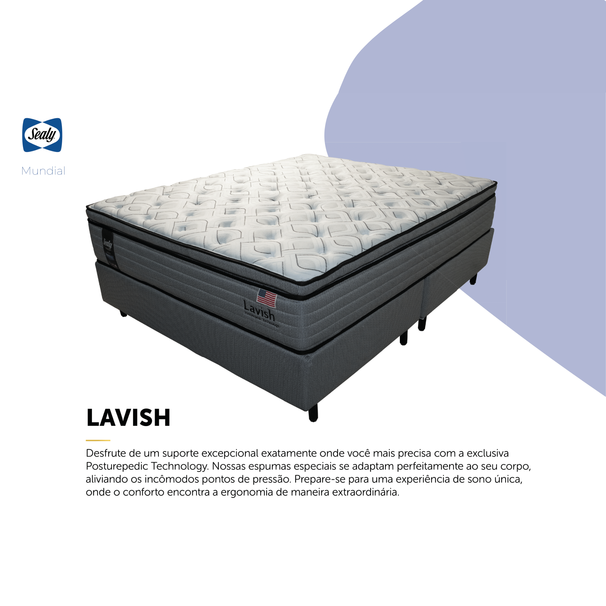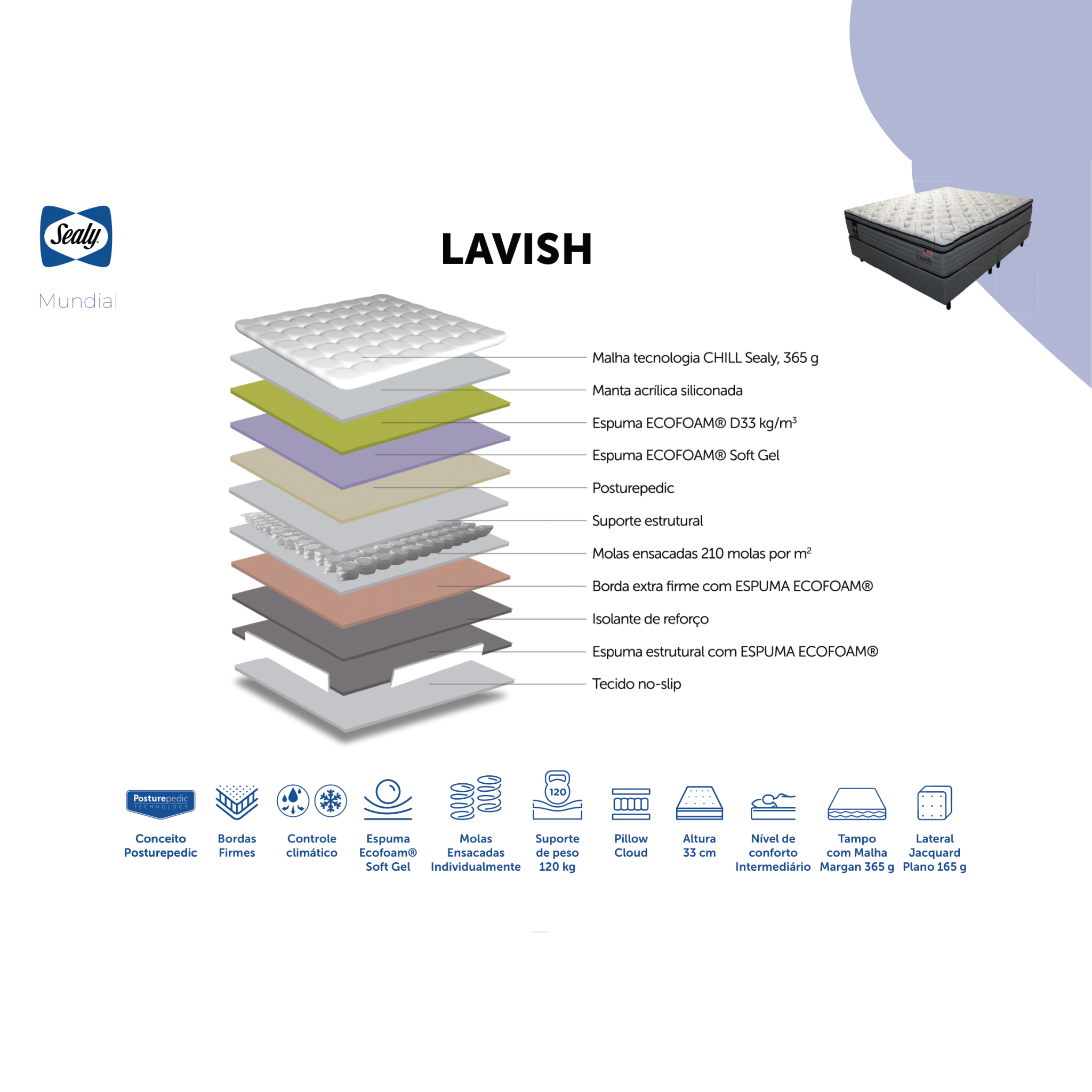 O colchão Lavish Sealy tem molas ensacadas individualmente. Ele tem 33 cm de altura. A tecnologia Posturepedic oferece suporte ergonômico. A camada superior de conforto se chama Pillow Cloud. O tecido do tampo é de malha Margan. Ele dissipa calor e umidade. O colchão suporta até 120 kg por pessoa.