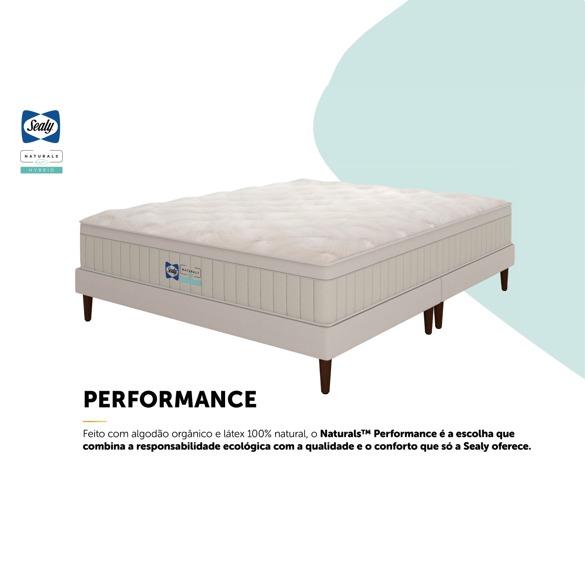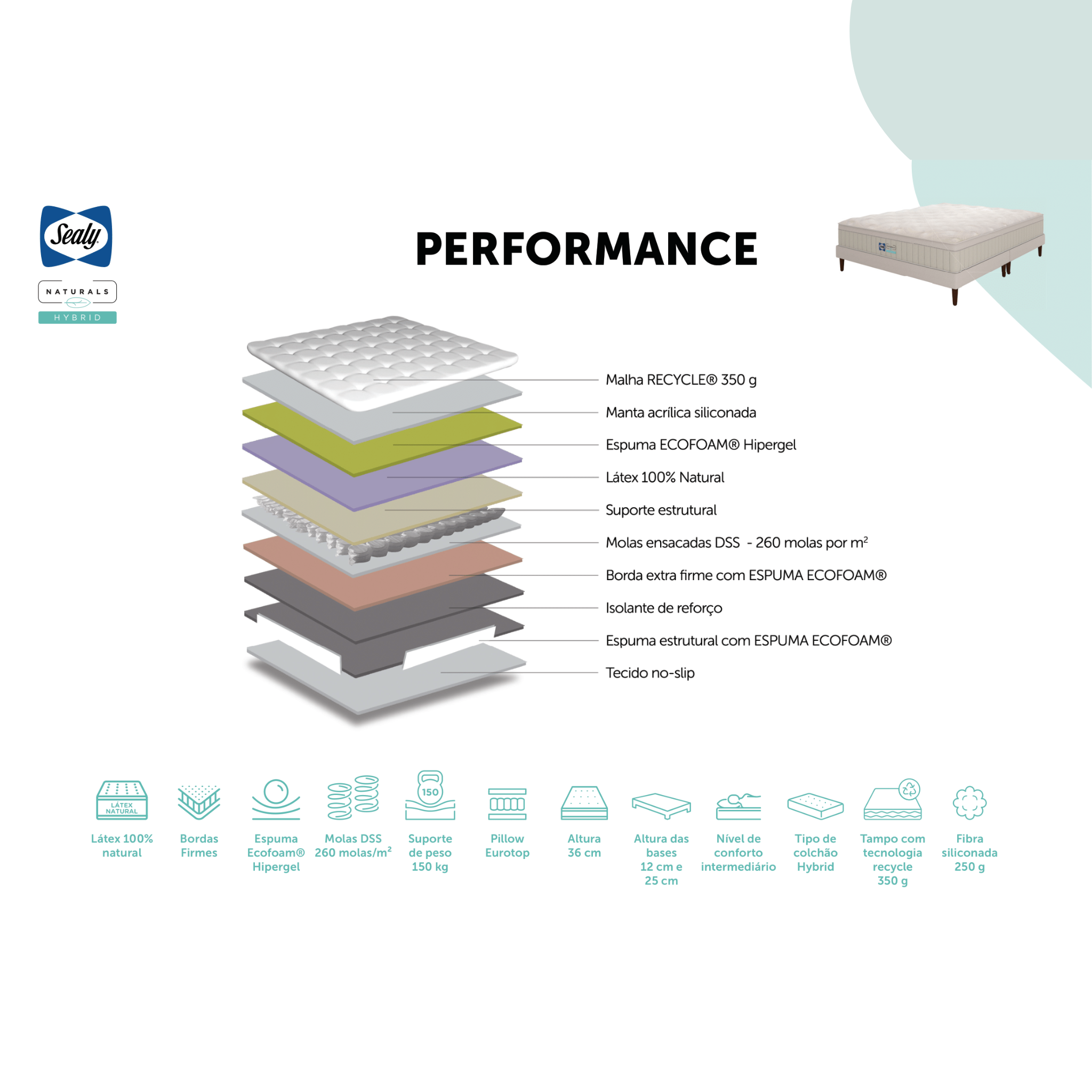 Este é um colchão híbrido da linha Naturals Performance. Ele tem 36 cm de altura. Ele usa materiais naturais e sustentáveis. A camada de conforto tem látex 100% natural e espuma Ecofoam Hipersoft Gel. A estrutura tem molas DSS para suporte ortopédico. Elas minimizam a transferência de movimento. O colchão suporta até 150 kg por pessoa. O Pillow Eurotop adiciona uma camada extra de conforto. As bordas reforçadas evitam deformação.