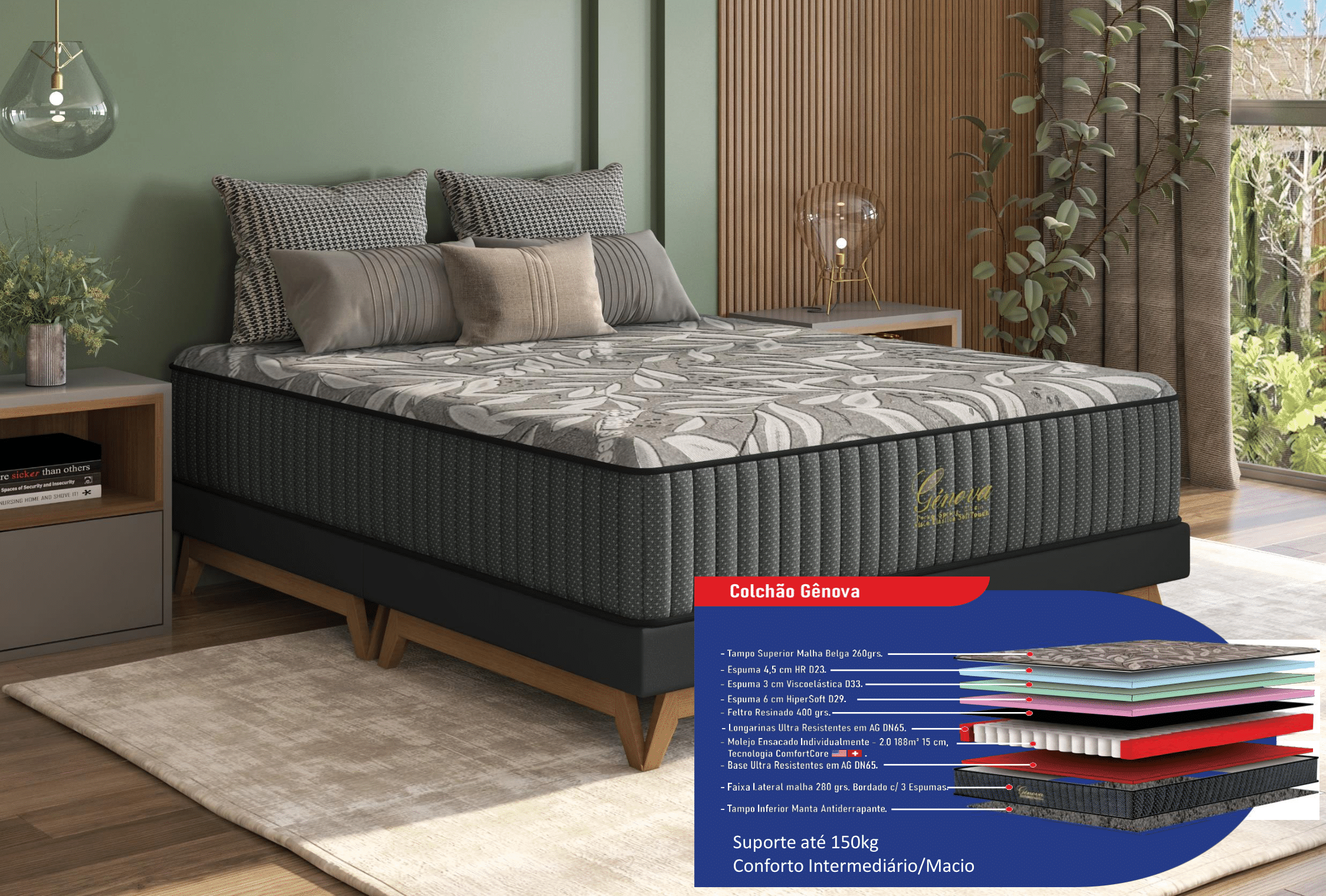 O colchão Softflex Gênova tem molas ensacadas, que se ajustam ao seu corpo. As molas ensacadas individualmente minimizam a transferência de movimento. Uma pessoa que se move não incomoda a outra. A espuma é de densidade D33. O nível de conforto é intermediário. O tecido de revestimento é de malha. O colchão também tem um tratamento contra ácaros e fungos. O suporte de peso é de 120 kg por pessoa.