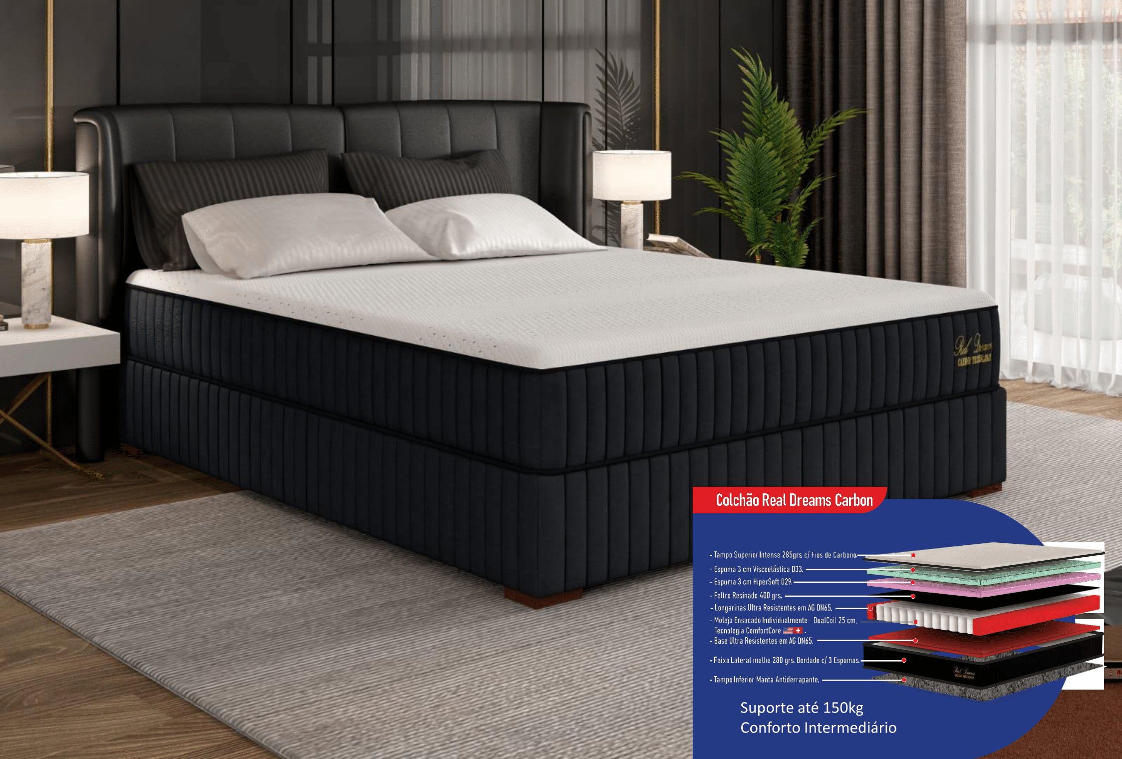 O colchão Softflex Real Dreams Carbon tem molas ensacadas, que se ajustam ao seu corpo. As molas ensacadas individualmente minimizam a transferência de movimento. Uma pessoa que se move não incomoda a outra. O colchão tem tratamento de carbono para neutralizar odores e um pillow top. O nível de conforto é firme. O tecido de revestimento é de malha.
