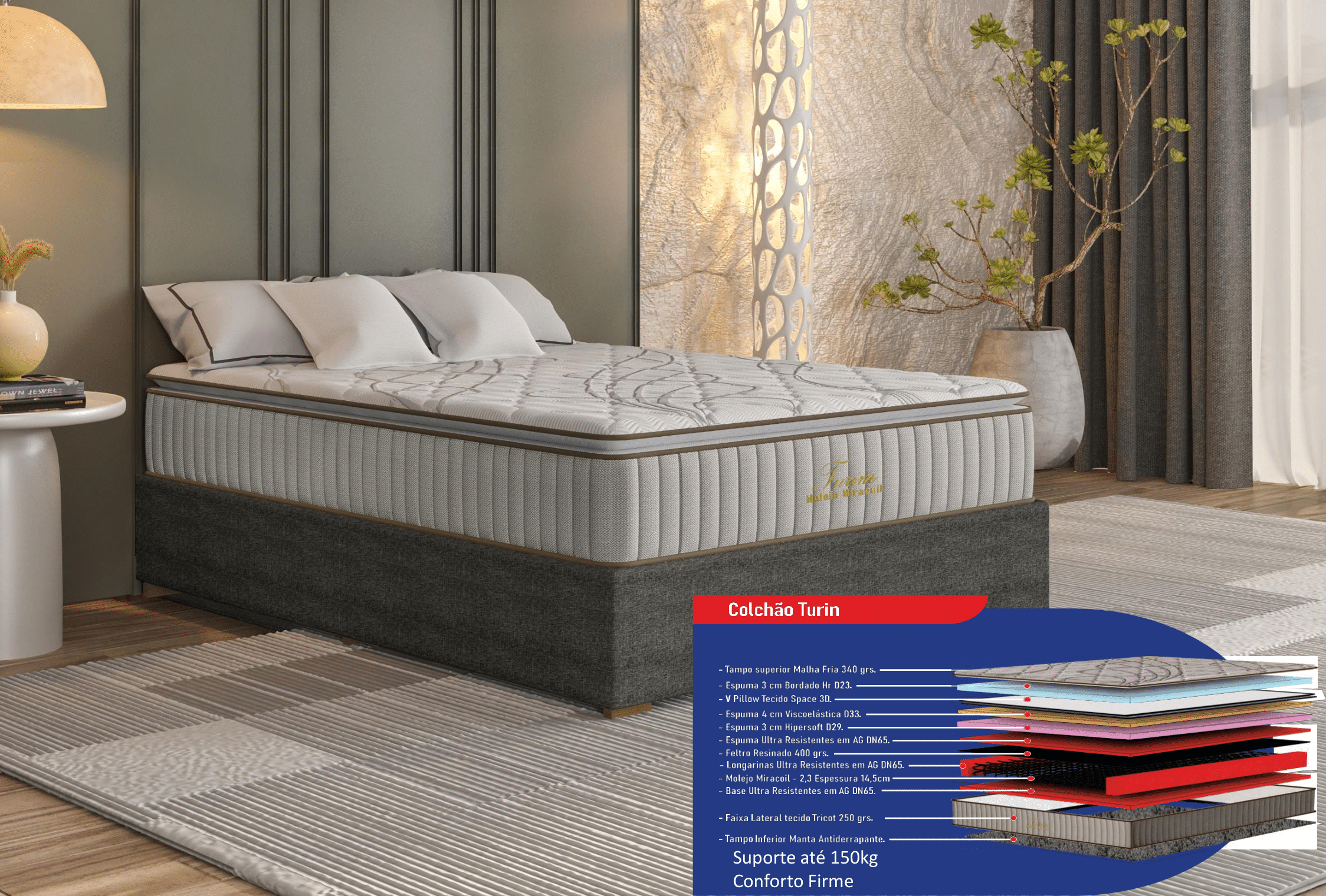 O colchão Softflex Turim tem molas ensacadas, que se ajustam ao seu corpo. As molas ensacadas individualmente minimizam a transferência de movimento. Uma pessoa que se move não incomoda a outra. O colchão tem uma camada de espuma D33. O nível de firmeza é intermediário. O colchão também tem um pillow top e um tratamento contra ácaros e fungos. O suporte de peso é de 120 kg por pessoa.