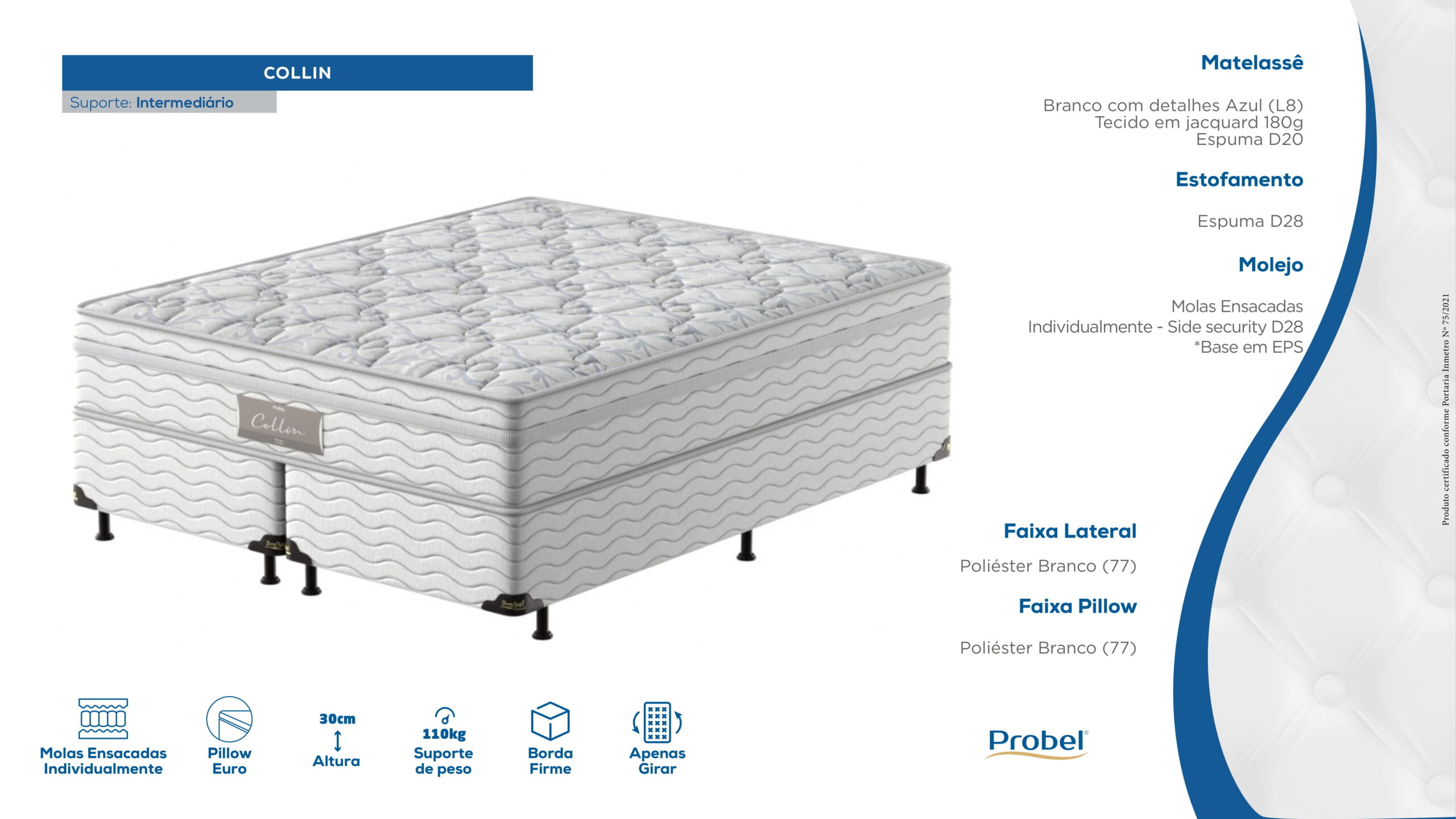 O colchão Probel Collin tem molas ensacadas, que se ajustam ao seu corpo. As molas ensacadas individualmente minimizam a transferência de movimento. Uma pessoa que se move não incomoda a outra. O colchão tem uma camada de conforto de espuma D33. O tecido de revestimento é de malha. O colchão também tem um tratamento contra ácaros e fungos. O suporte de peso é de 120 kg por pessoa.