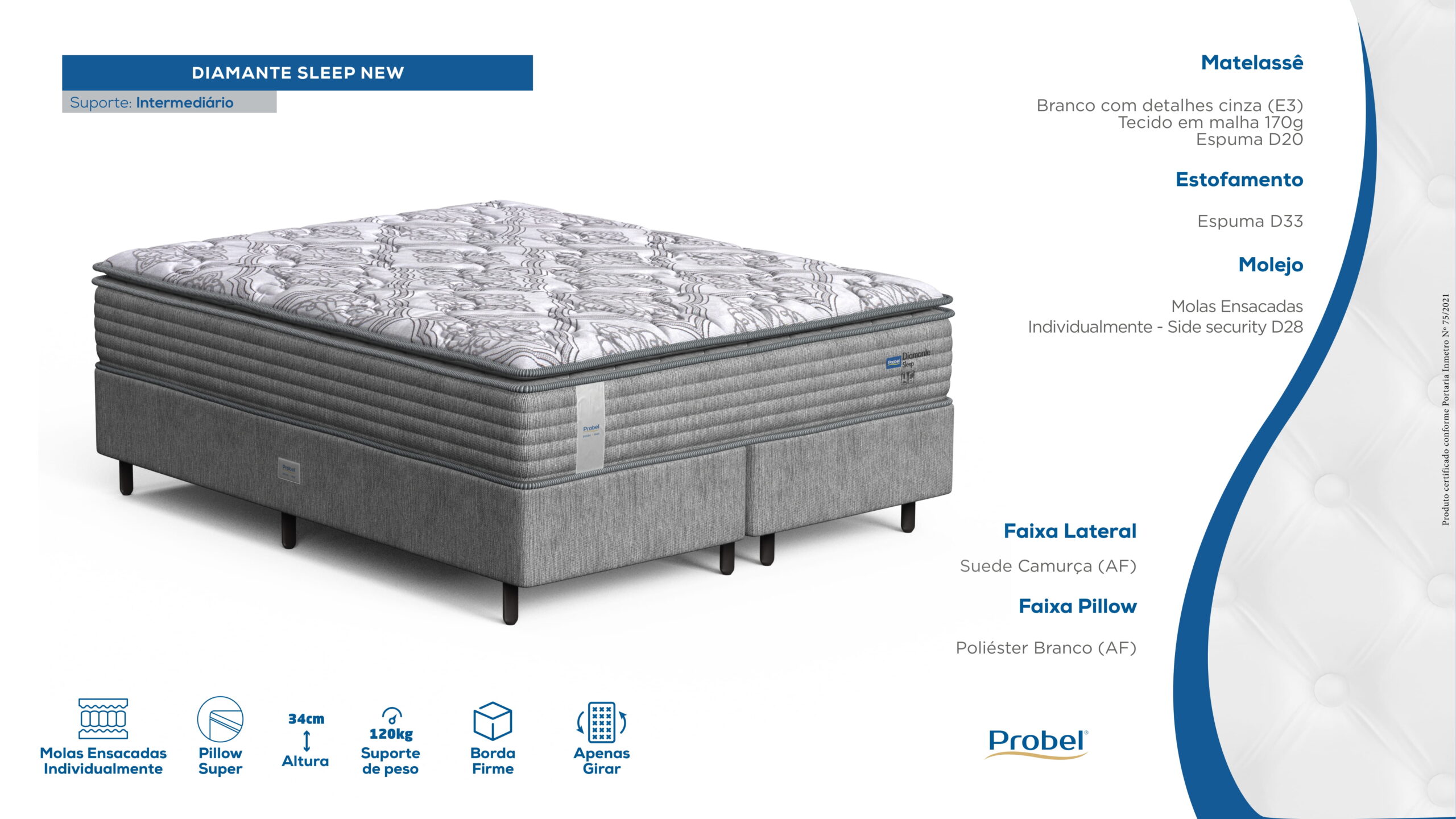 O colchão Probel Diamante Sleep New tem molas ensacadas. O sistema de molas fornece suporte individualizado, se moldando ao seu corpo. Uma pessoa não sente o movimento da outra. A camada de espuma é de densidade D33. O tecido de revestimento é de malha. O colchão também tem um tratamento contra ácaros, fungos e bactérias. O suporte de peso é de 120 kg por pessoa.