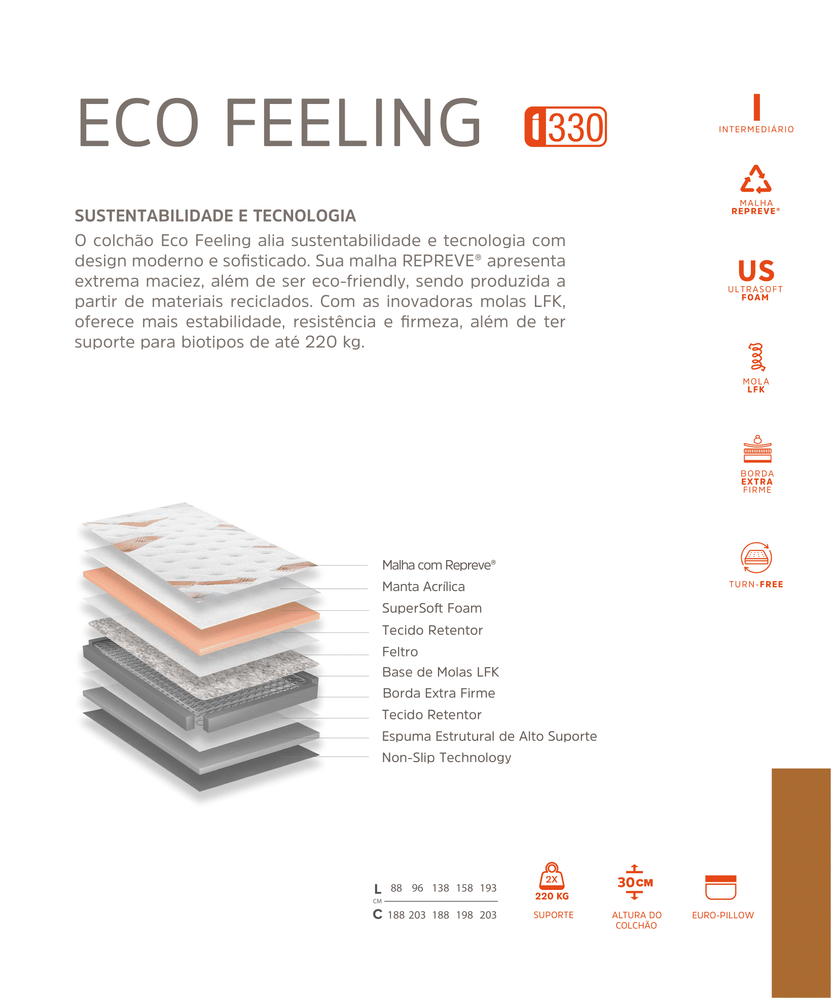 O Colchão Eco Feeling é a escolha ideal para quem busca um colchão com conforto intermediário, suporte excepcional para cargas elevadas e um forte compromisso com a sustentabilidade, tudo para garantir noites de sono verdadeiramente reparadoras e conscientes.