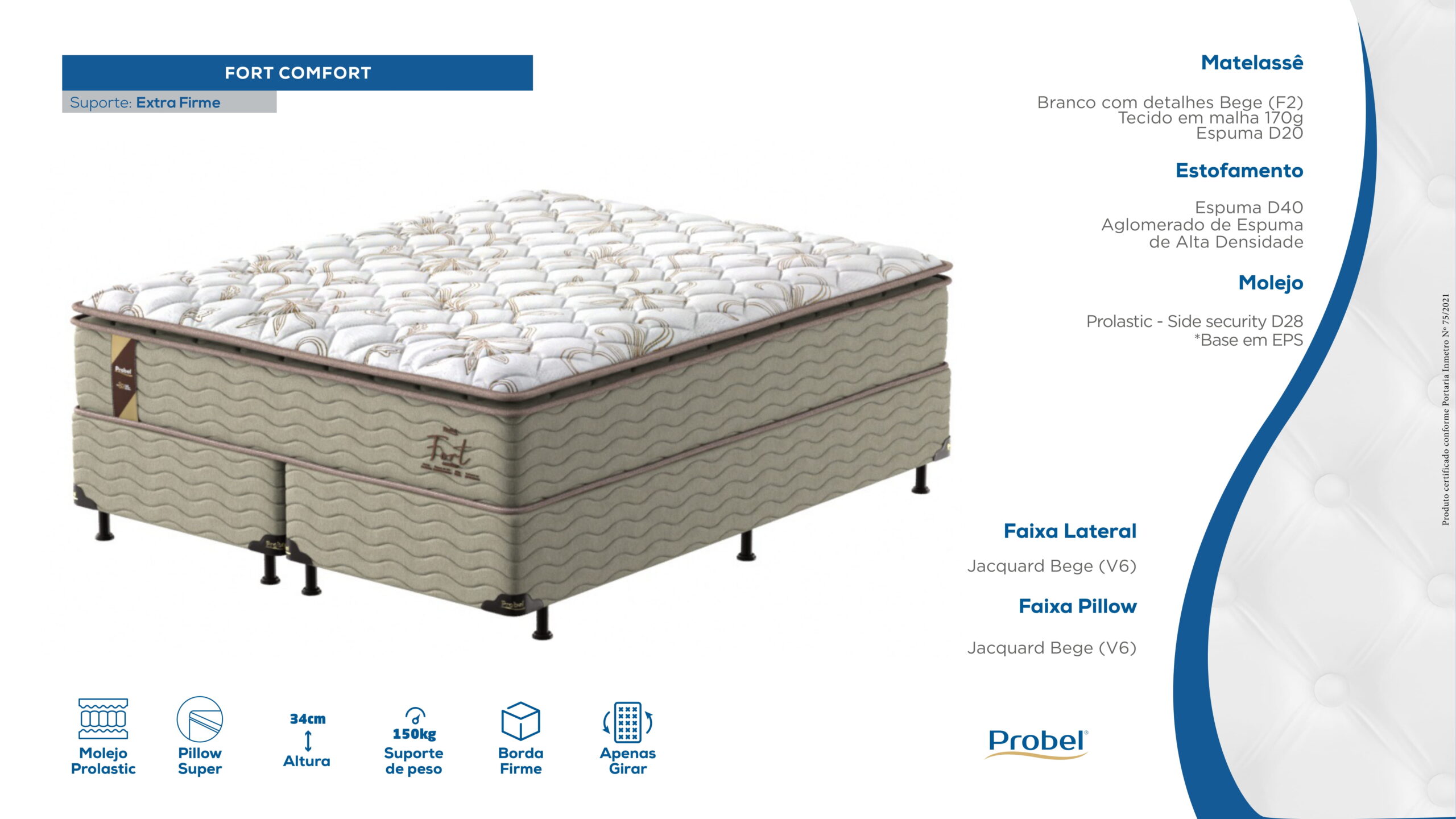 O colchão Probel Fort Comfort tem molas ensacadas, que se ajustam ao seu corpo. As molas ensacadas individualmente minimizam a transferência de movimento. Uma pessoa que se move não incomoda a outra. A espuma tem densidade D65 e o tecido de revestimento é de malha. O colchão também tem um tratamento contra ácaros e fungos. O suporte de peso é de 150 kg por pessoa.