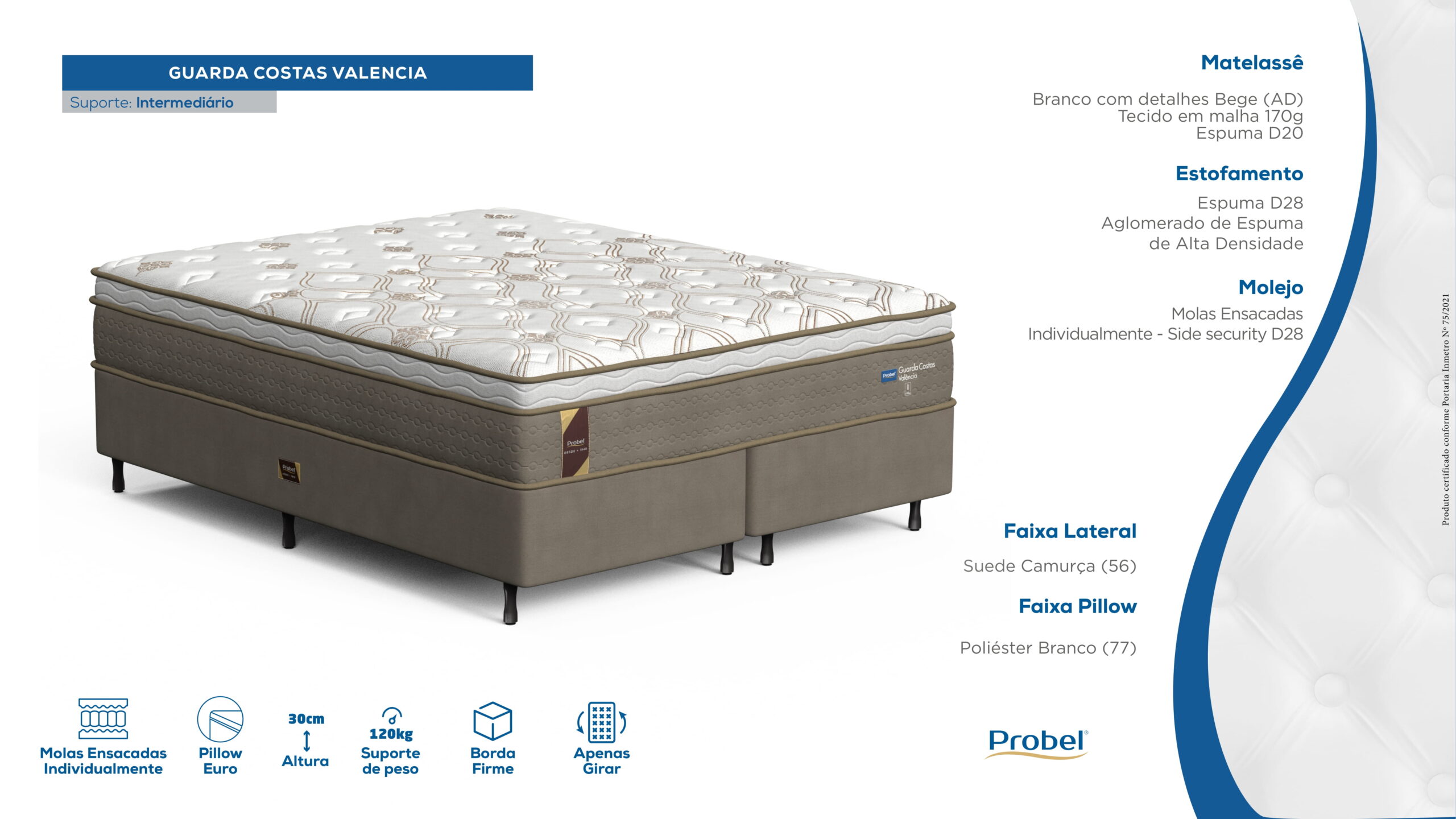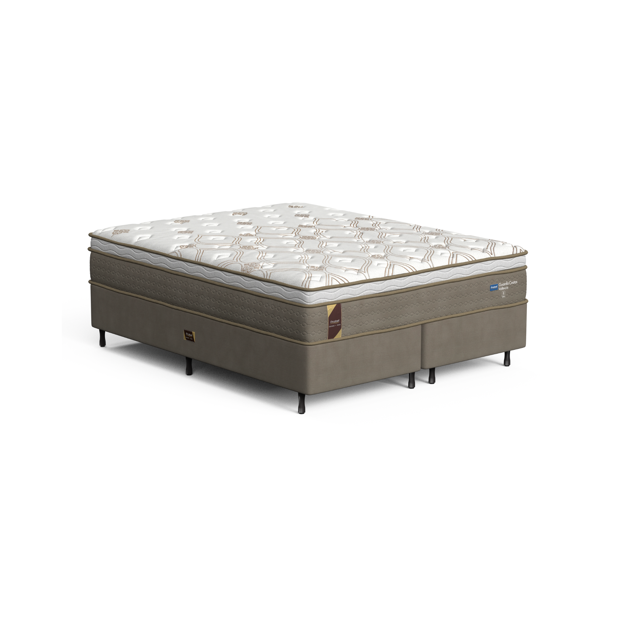 Este colchão tem molas ensacadas, que se ajustam ao seu corpo. As molas ensacadas individualmente minimizam a transferência de movimento. Uma pessoa que se move não incomoda a outra. O colchão tem uma camada de espuma com densidade D45. A superfície tem um pillow top. O tampo é de malha e as laterais são de suede. O colchão tem tecnologia No Turn, que dispensa a necessidade de virá-lo. O suporte de peso é de 150 kg por pessoa.