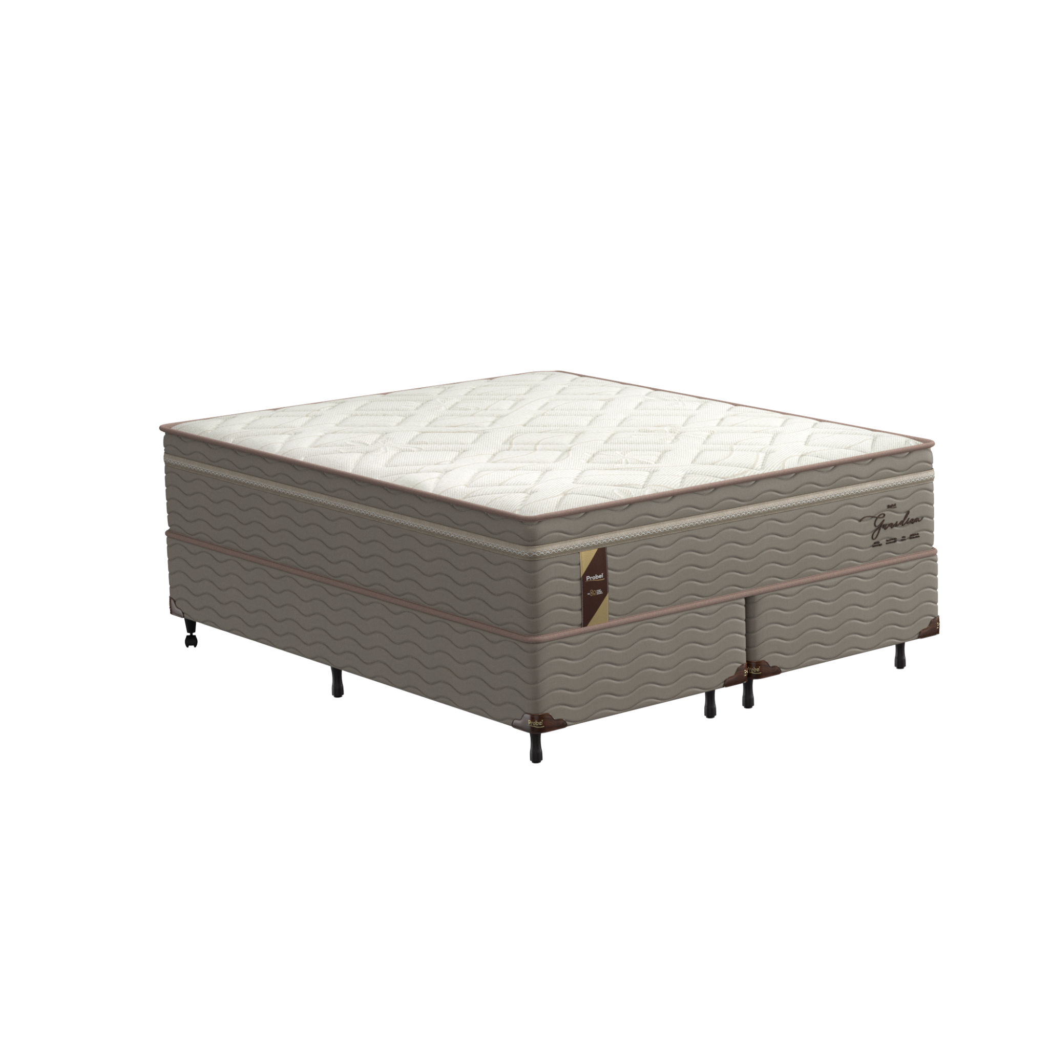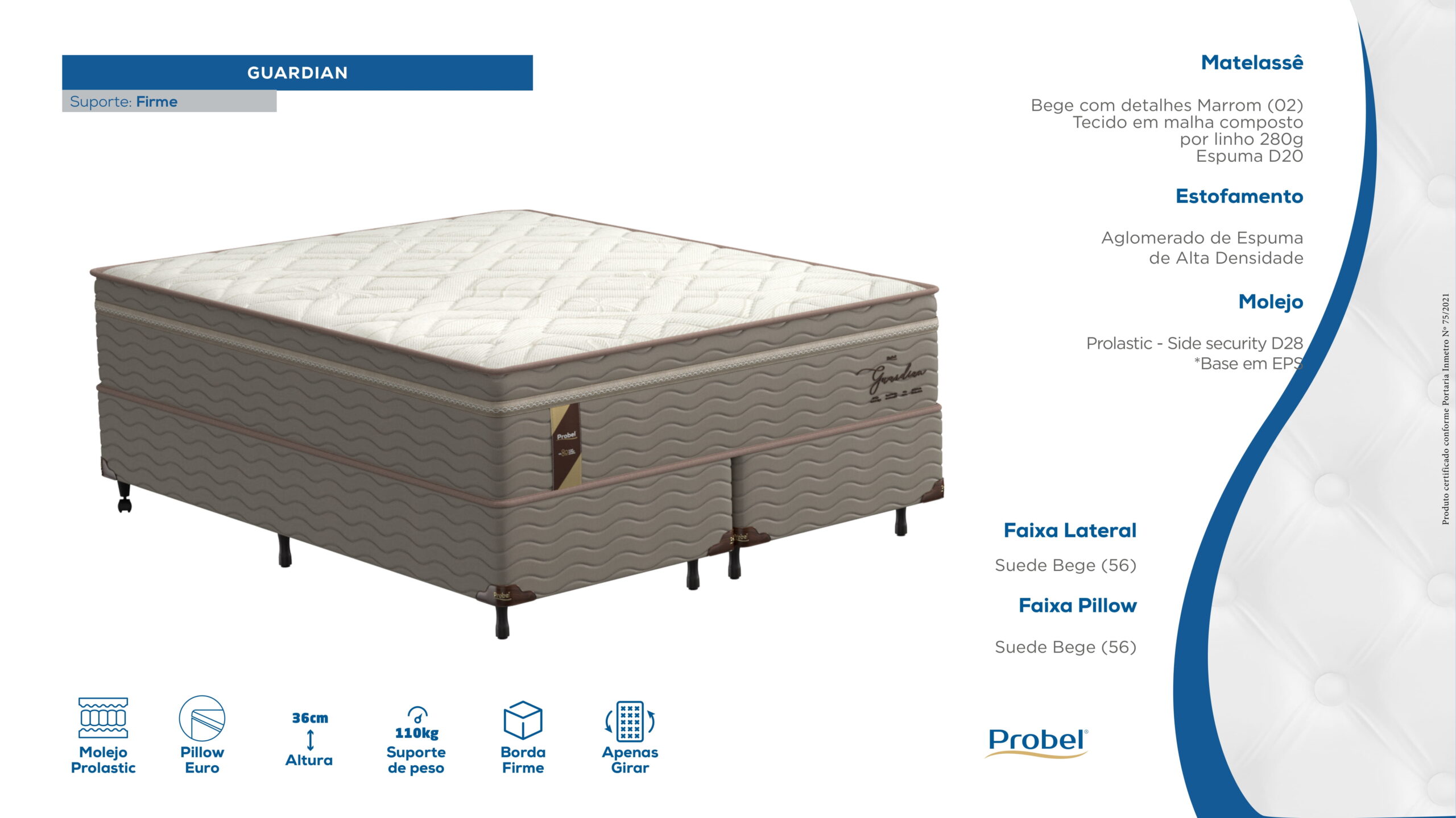 O colchão Probel Guardian tem molas ensacadas, que se ajustam ao seu corpo. As molas ensacadas individualmente minimizam a transferência de movimento. Uma pessoa que se move não incomoda a outra. O colchão tem uma camada de conforto de espuma D45. O tampo é de malha e as laterais são de suede. O colchão também tem um tratamento contra ácaros e fungos. O suporte de peso é de 150 kg por pessoa.