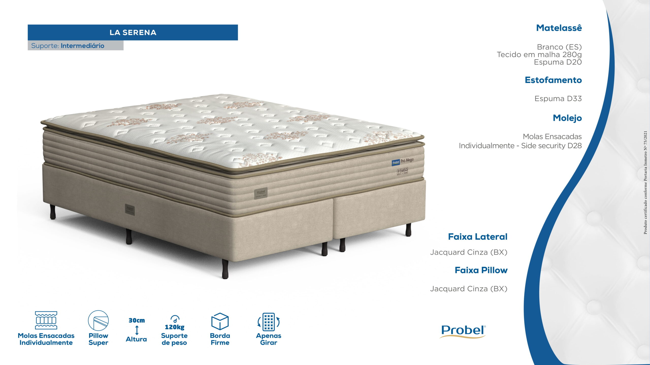 O colchão Probel La Serena tem molas ensacadas, que se ajustam ao seu corpo. As molas ensacadas individualmente minimizam a transferência de movimento. Uma pessoa que se move não incomoda a outra. O colchão tem uma camada de conforto de espuma D33. O tecido de revestimento é de malha. O colchão também tem um tratamento contra ácaros e fungos. O suporte de peso é de 120 kg por pessoa.