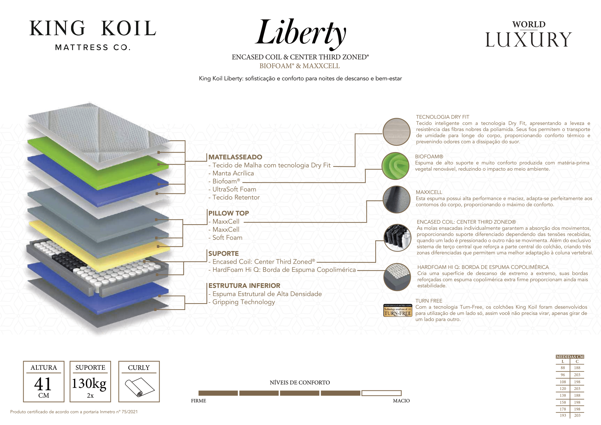 Com uma altura de 41 cm, o Colchão Liberty oferece uma presença imponente e um suporte robusto de até 130 kg por pessoa, adaptando-se a diversos biotipos e necessidades de descanso.