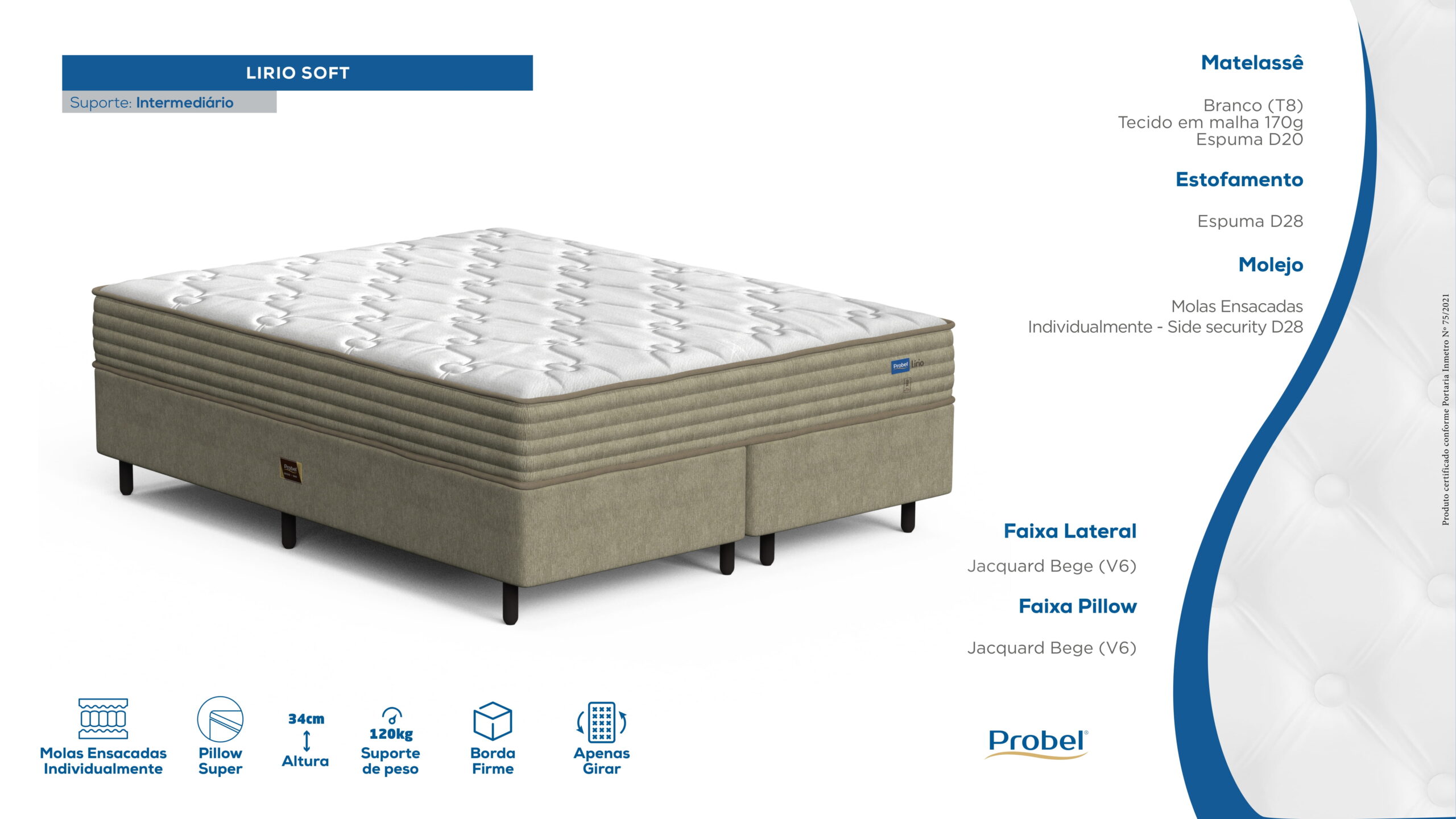 O colchão Probel Lírio Soft tem molas ensacadas, que se ajustam ao contorno do seu corpo. As molas ensacadas individualmente minimizam a transferência de movimento. Uma pessoa que se move não incomoda a outra. O colchão tem uma camada de espuma de densidade D28 e um tecido de revestimento macio. O produto tem um tratamento contra ácaros, fungos e bactérias. O suporte de peso é de 100 kg por pessoa.