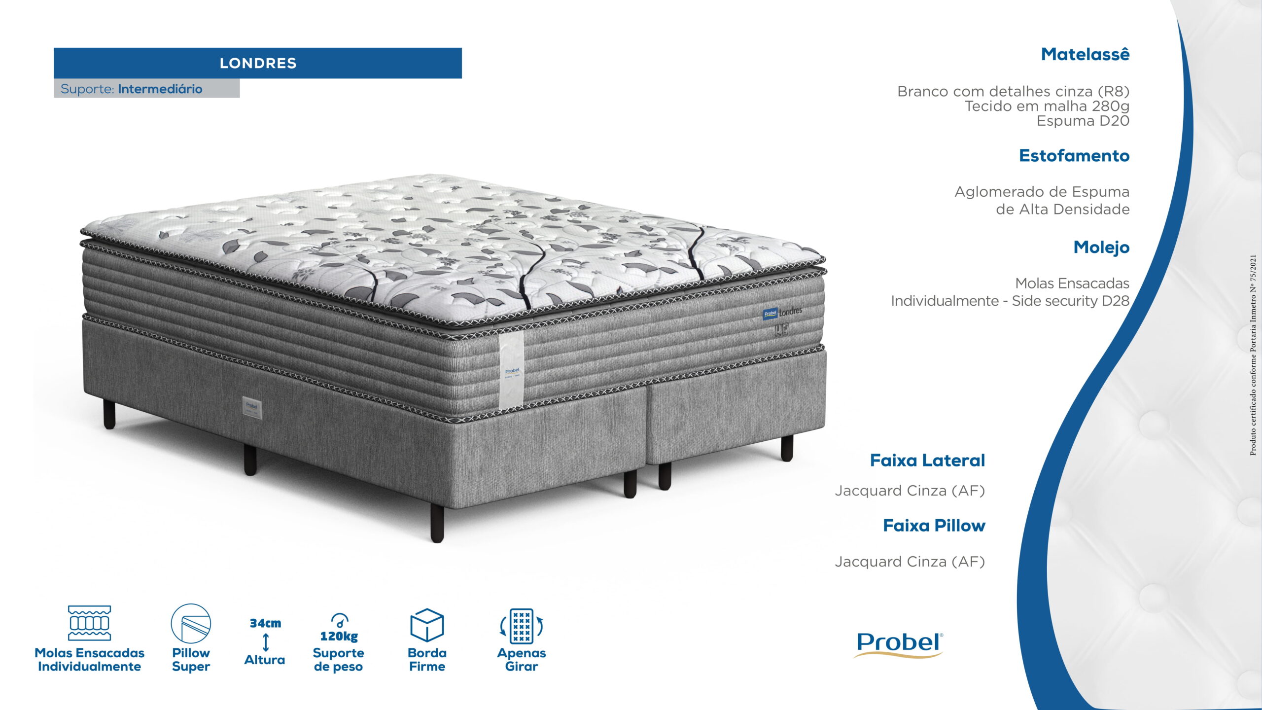 O colchão Probel Londres tem molas ensacadas, que se adaptam ao seu corpo. As molas ensacadas individualmente minimizam a transferência de movimento. Uma pessoa que se move não incomoda a outra. A espuma tem densidade D33. A superfície tem um pillow top. O tecido de revestimento é de malha. O colchão também tem um tratamento contra ácaros e fungos. O suporte de peso é de 120 kg por pessoa.