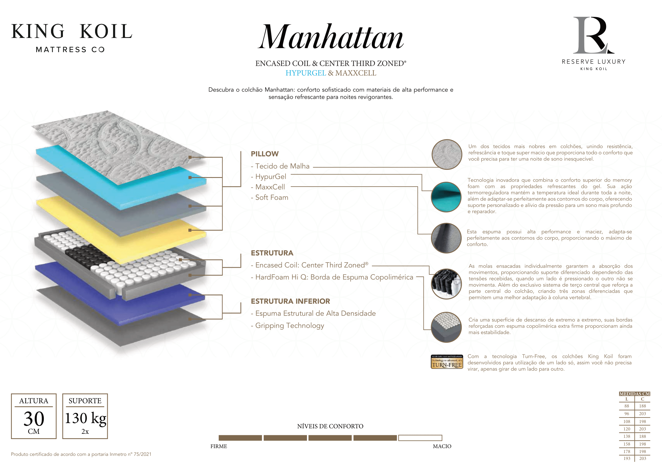 O Colchão Manhattan é a escolha ideal para quem busca um colchão com suporte zonal inteligente, o conforto refrescante da espuma com gel e a praticidade do sistema Turn-Free, garantindo noites de sono reparadoras e adaptadas às suas necessidades.