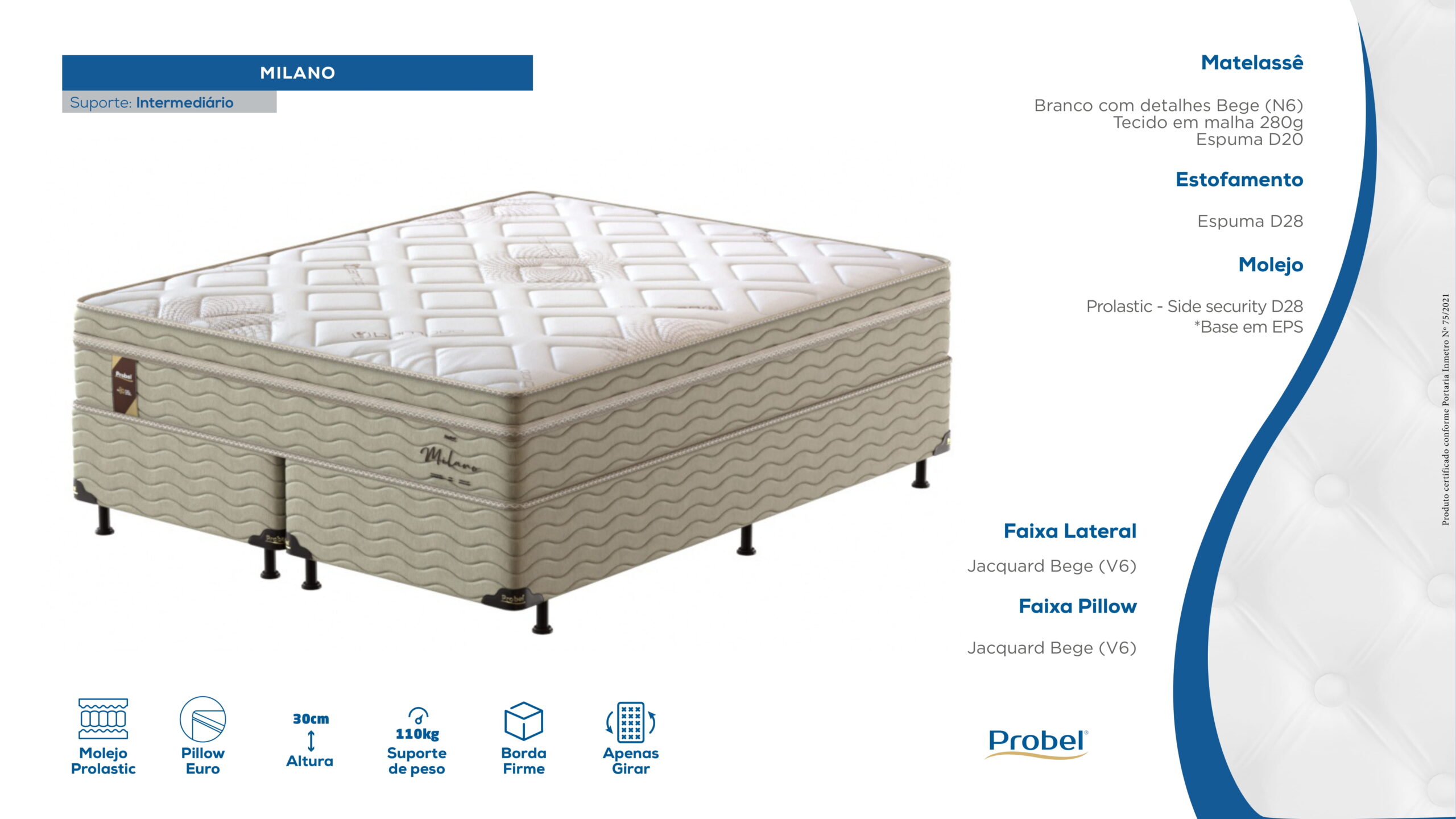 O colchão Probel Milano tem molas ensacadas, que se ajustam ao seu corpo. As molas ensacadas individualmente minimizam a transferência de movimento. Uma pessoa que se move não incomoda a outra. O colchão tem uma camada de conforto de espuma D33. O tecido de revestimento é de malha. O colchão também tem um tratamento contra ácaros e fungos. O suporte de peso é de 120 kg por pessoa.