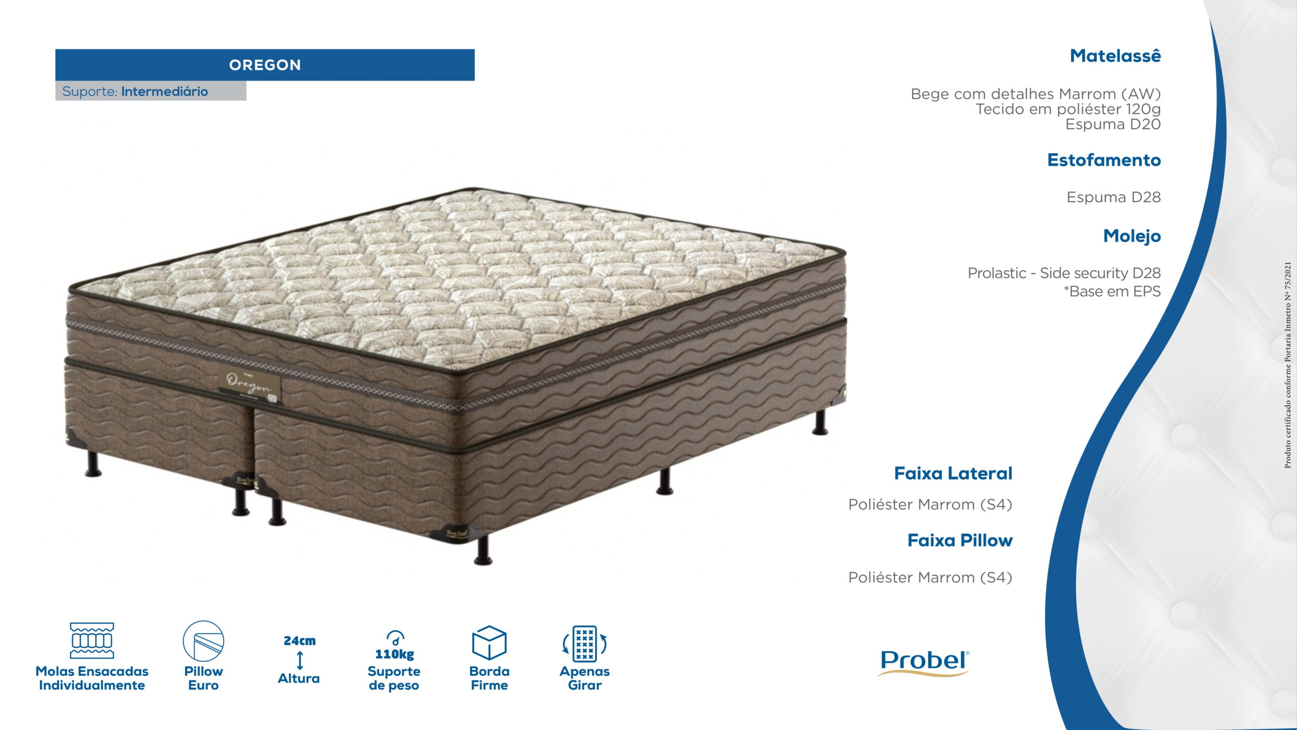 O colchão Probel Oregon tem molas ensacadas, que se ajustam ao seu corpo. As molas ensacadas individualmente minimizam a transferência de movimento. Uma pessoa que se move não incomoda a outra. O colchão tem uma camada de conforto de espuma D33. O tecido de revestimento é de malha. O colchão também tem um tratamento contra ácaros e fungos. O suporte de peso é de 120 kg por pessoa.