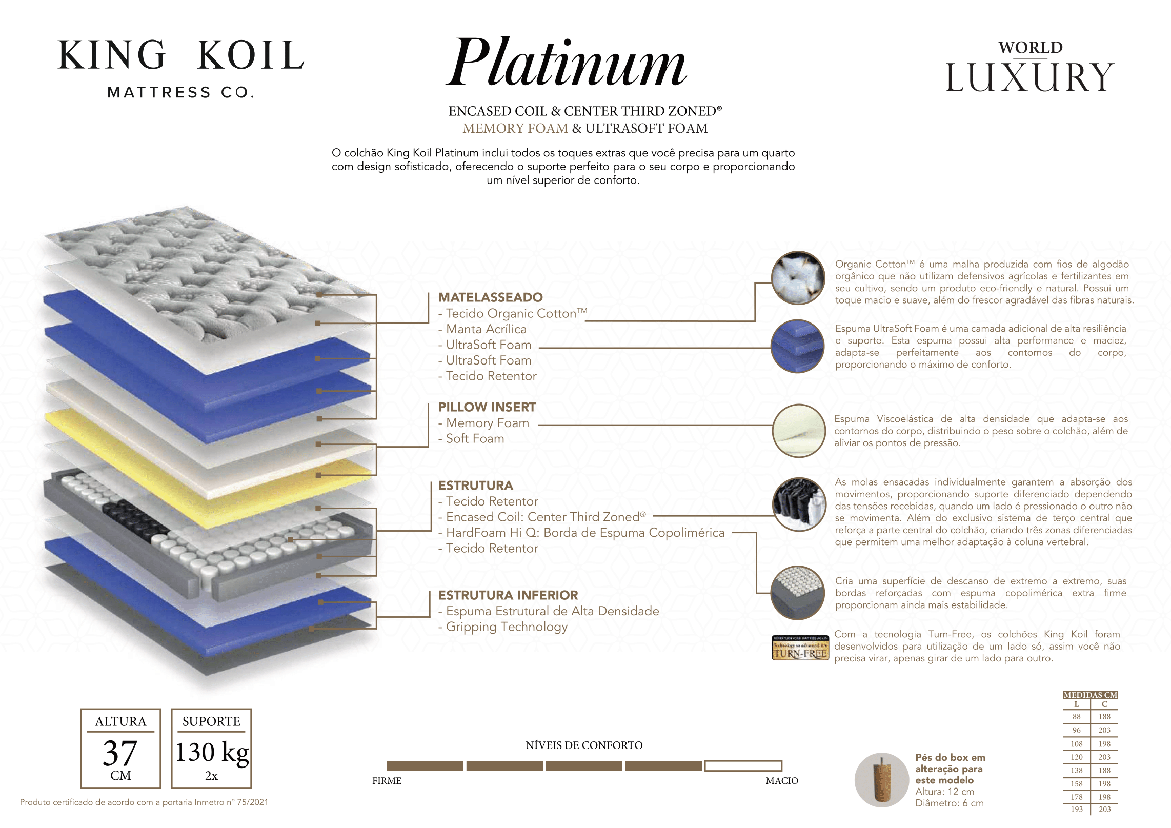 Com uma altura de 37 cm, o Colchão Platinum oferece uma presença imponente e um suporte robusto de até 130 kg por pessoa, adaptando-se a diversos biotipos e necessidades de descanso.