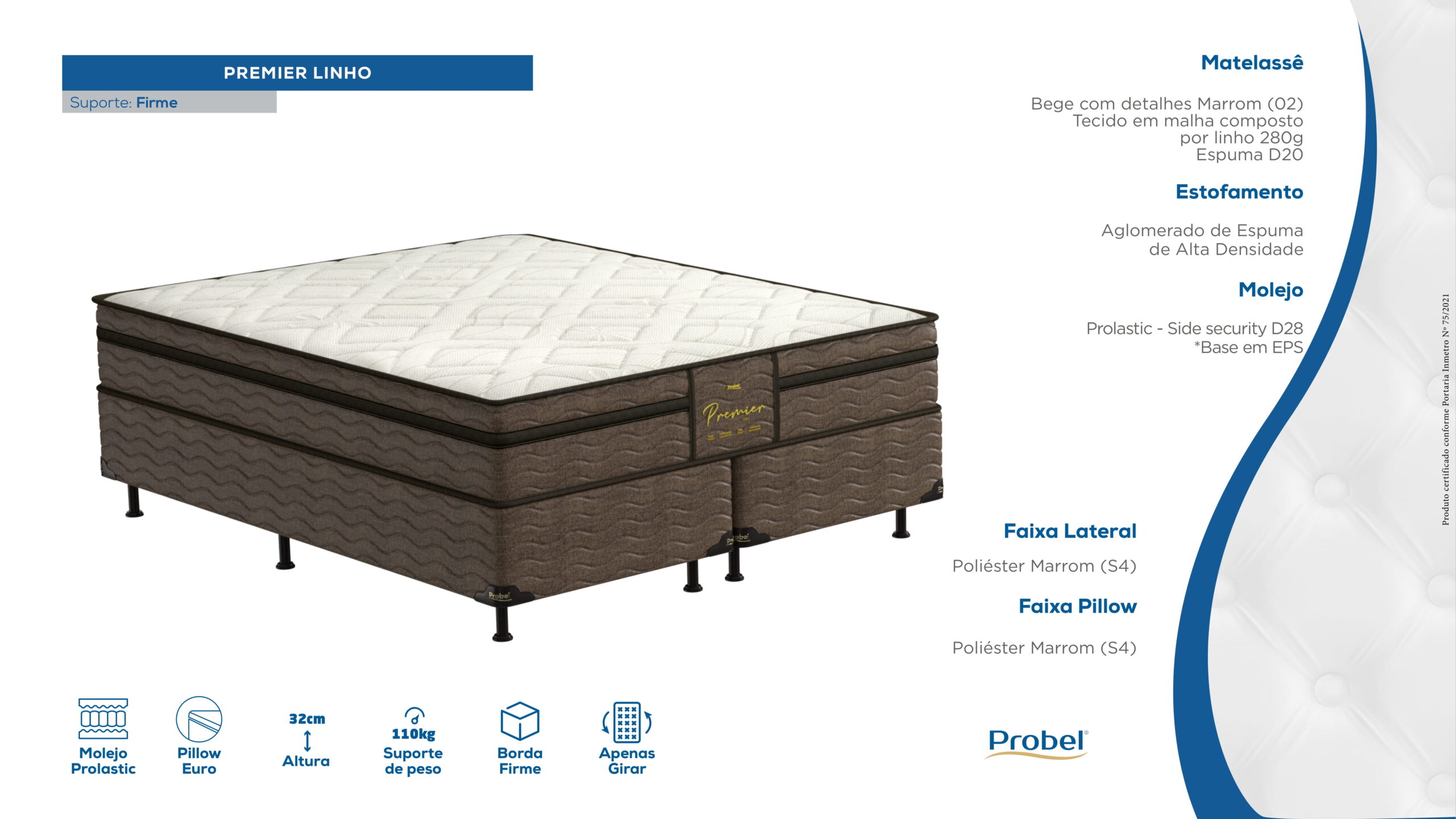 O colchão Probel Premier Linho tem molas ensacadas. Elas se ajustam ao contorno do seu corpo. As molas ensacadas individualmente minimizam a transferência de movimento. Uma pessoa que se move não incomoda a outra. A espuma tem densidade D33. O tecido de revestimento é de malha. O colchão também tem um tratamento contra ácaros e fungos. O suporte de peso é de 120 kg por pessoa.