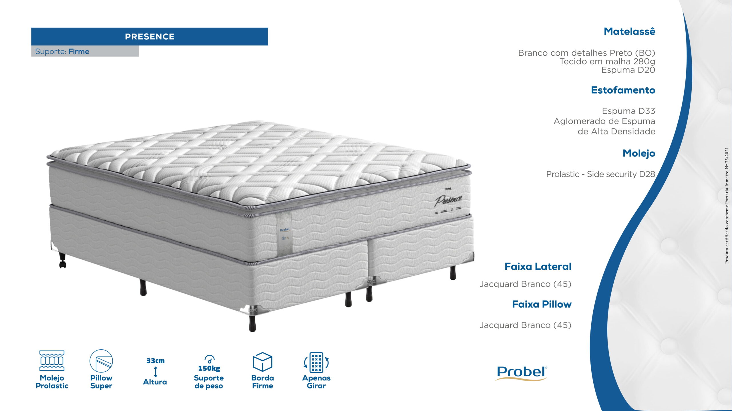 O colchão Probel Presence tem molas ensacadas, que oferecem suporte individualizado e isolam o movimento. A espuma tem densidade D33. O colchão possui uma camada extra de conforto. Ele tem um tratamento anti-ácaro, anti-fungo e anti-bactéria. O colchão também tem tecnologia No Turn. Este recurso elimina a necessidade de virar o produto.