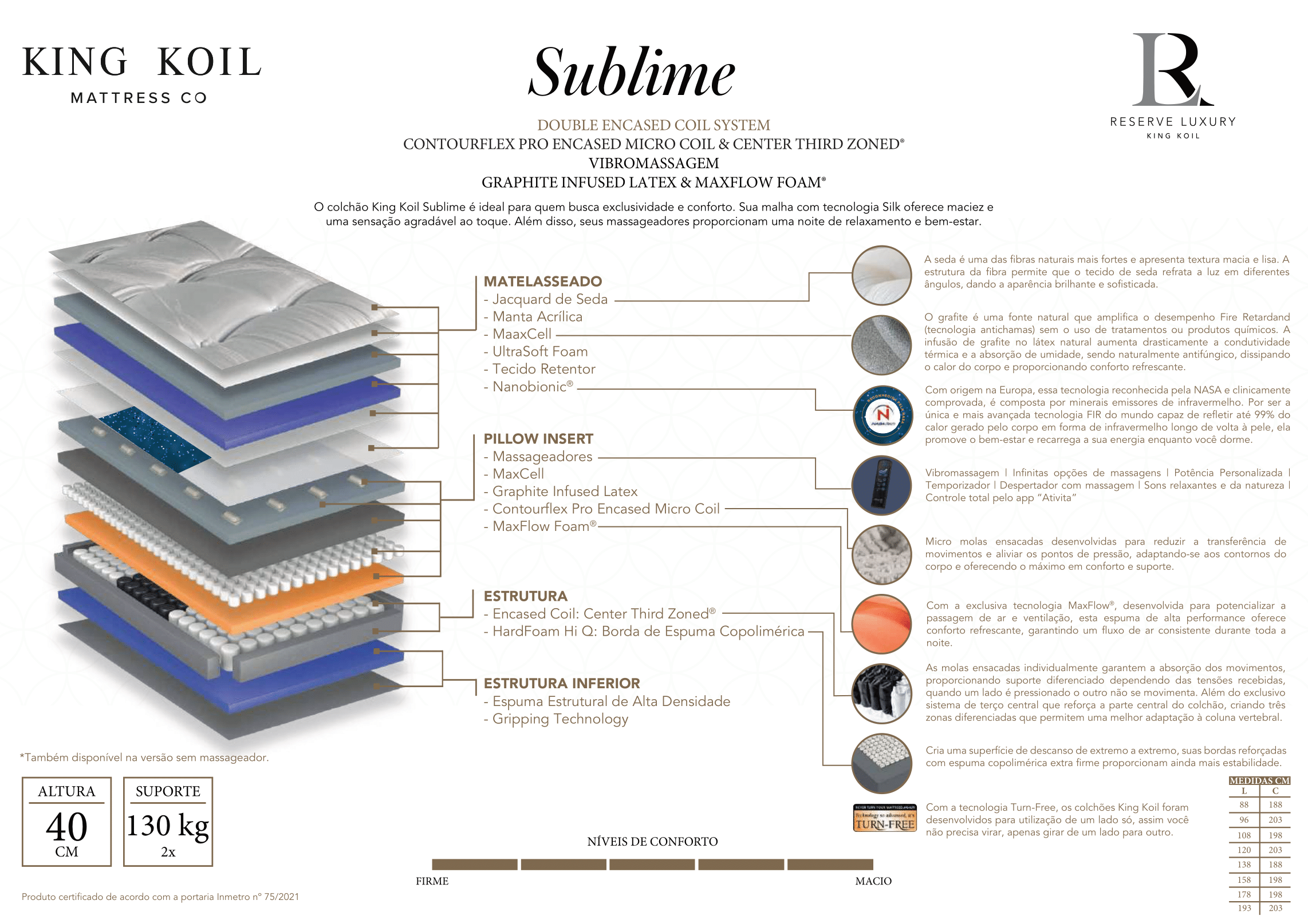 - Double Encased Coil System: Molas ensacadas duplamente encapsuladas que proporcionam um suporte individualizado e preciso, minimizando a transferência de movimento e garantindo estabilidade excepcional.