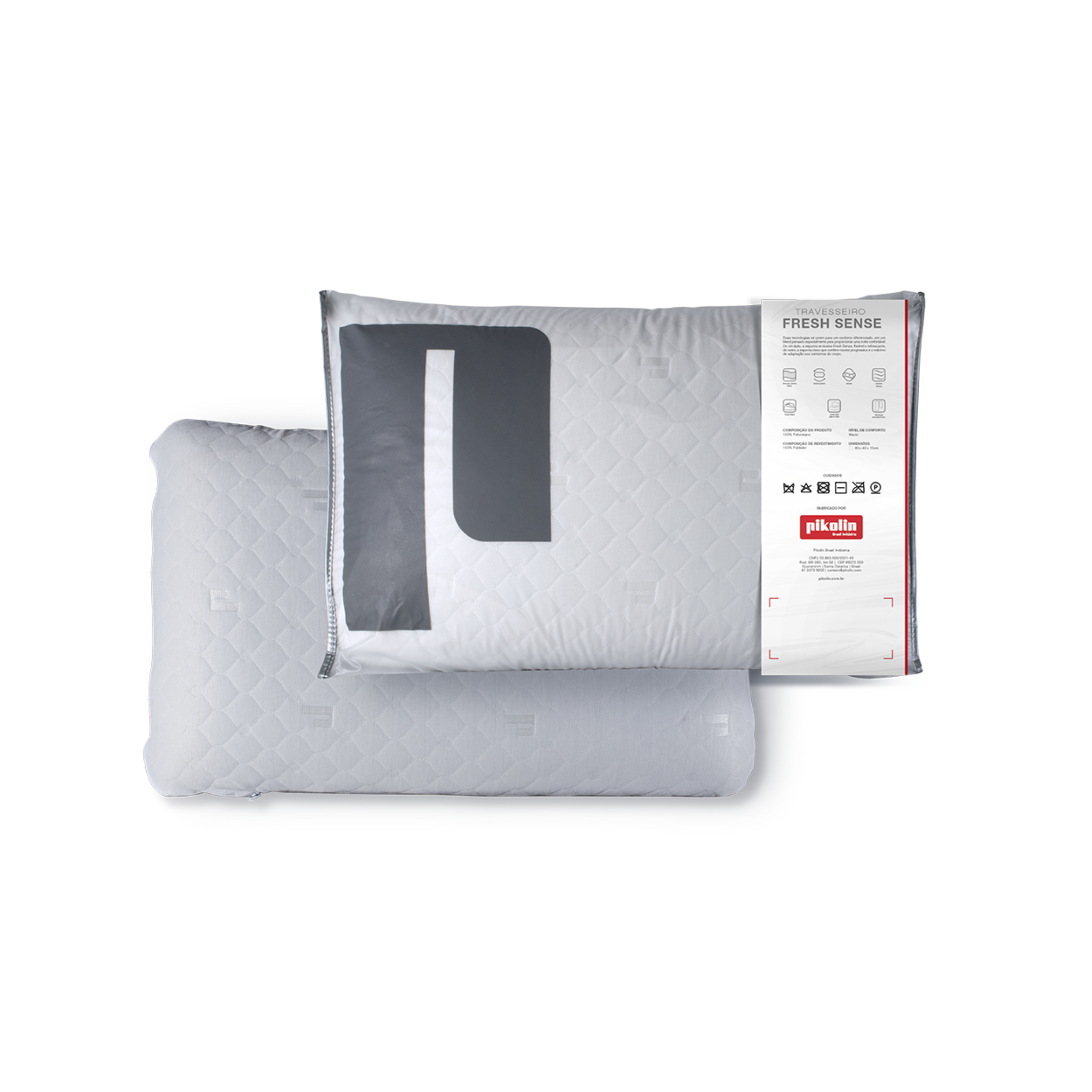 Este travesseiro usa a espuma Fresh Sense. É um material da Pikolin. Ele combina as propriedades de suporte refrescante do látex com a acomodação da espuma viscoelástica. As células abertas da espuma permitem a circulação de ar. Isso proporciona frescor. O travesseiro também tem um toque macio. Ele oferece suporte correto para a coluna. O produto tem tratamento antiácaros e antibacteriano. A altura é de 15 cm. As dimensões são 60 x 40 cm.