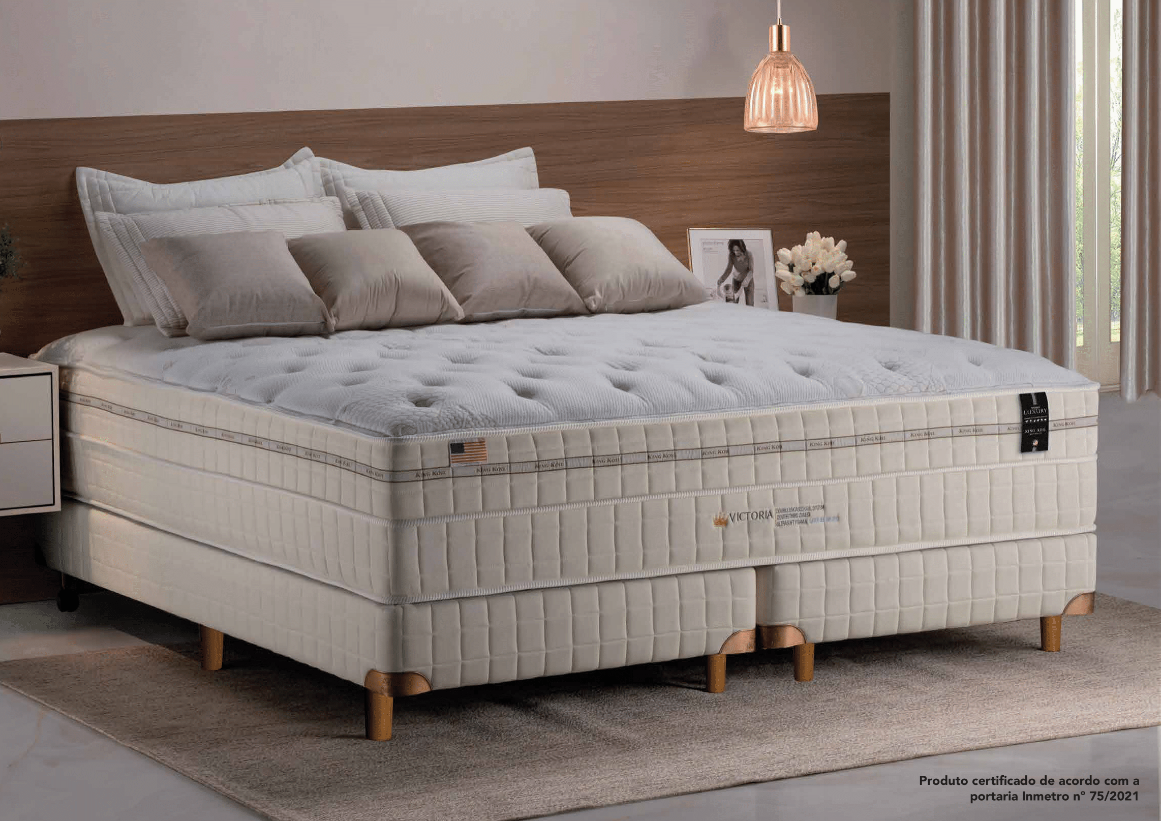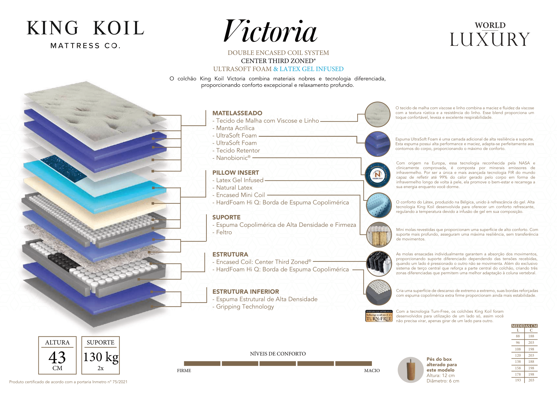 Com uma altura imponente de 43 cm, o Colchão Victoria não só se destaca visualmente, mas também oferece um suporte robusto de até 130 kg por pessoa, adaptando-se a diversos biotipos e necessidades.