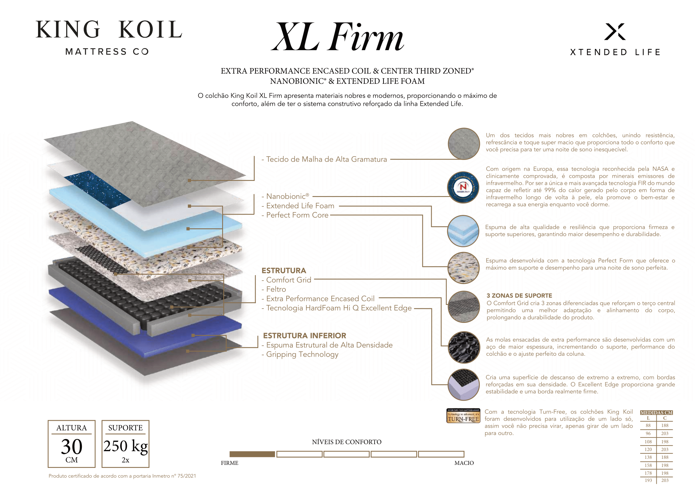 O Colchão XL Firm é a solução definitiva para quem busca um colchão com firmeza acentuada, suporte excepcional para cargas elevadas e tecnologias que garantem durabilidade e praticidade, proporcionando noites de sono seguras e profundamente reparadoras.