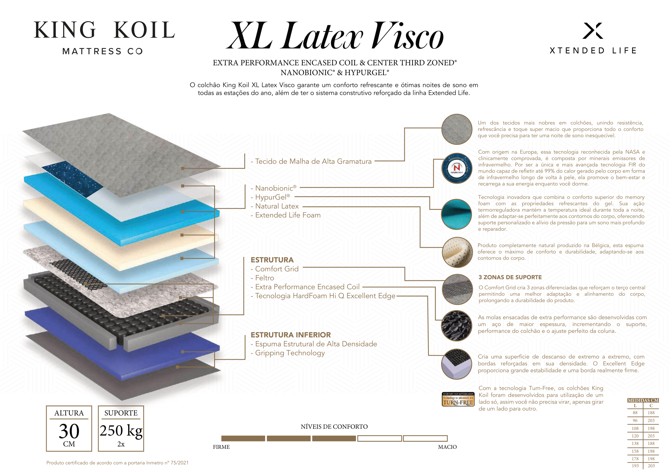 - Turn-Free: Elimina completamente a necessidade de virar o colchão, simplificando a manutenção e garantindo a consistência do conforto e do suporte ao longo do tempo.