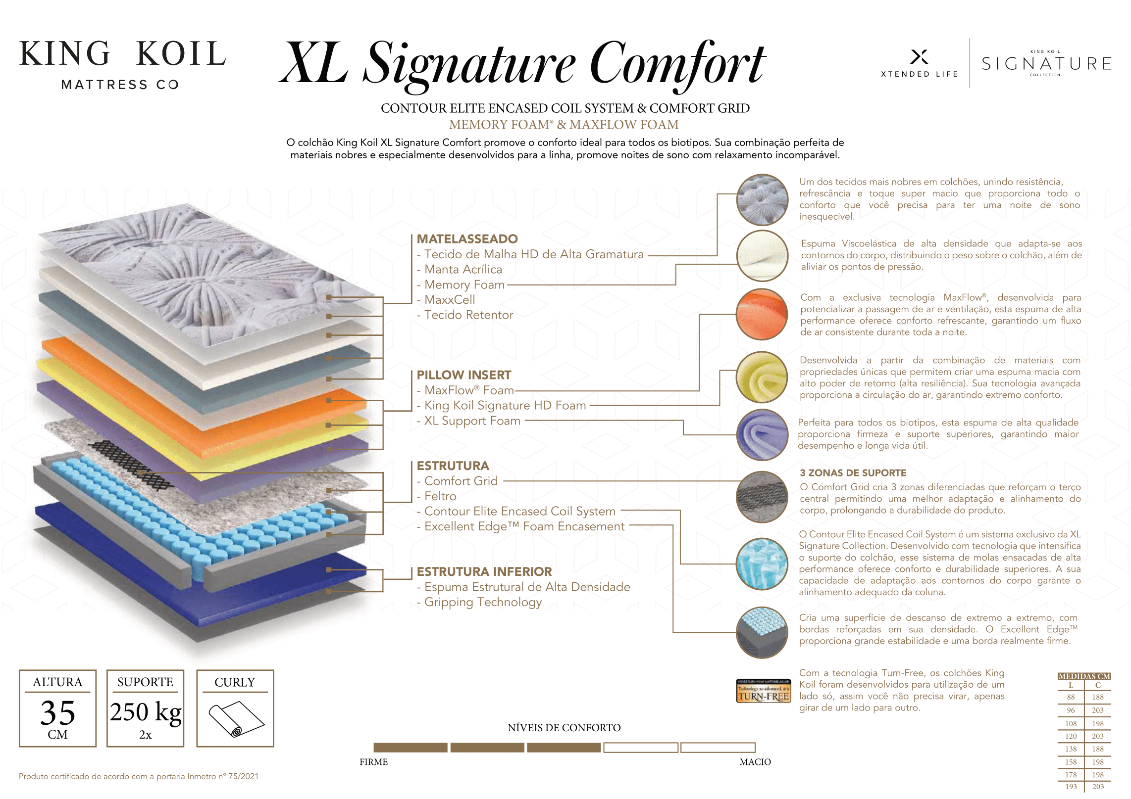 O Colchão XL Signature Comfort é a escolha definitiva para quem busca um colchão com suporte adaptativo de última geração, conforto premium de espumas avançadas e a durabilidade necessária para suportar cargas elevadas, garantindo noites de descanso profundas e revitalizantes.