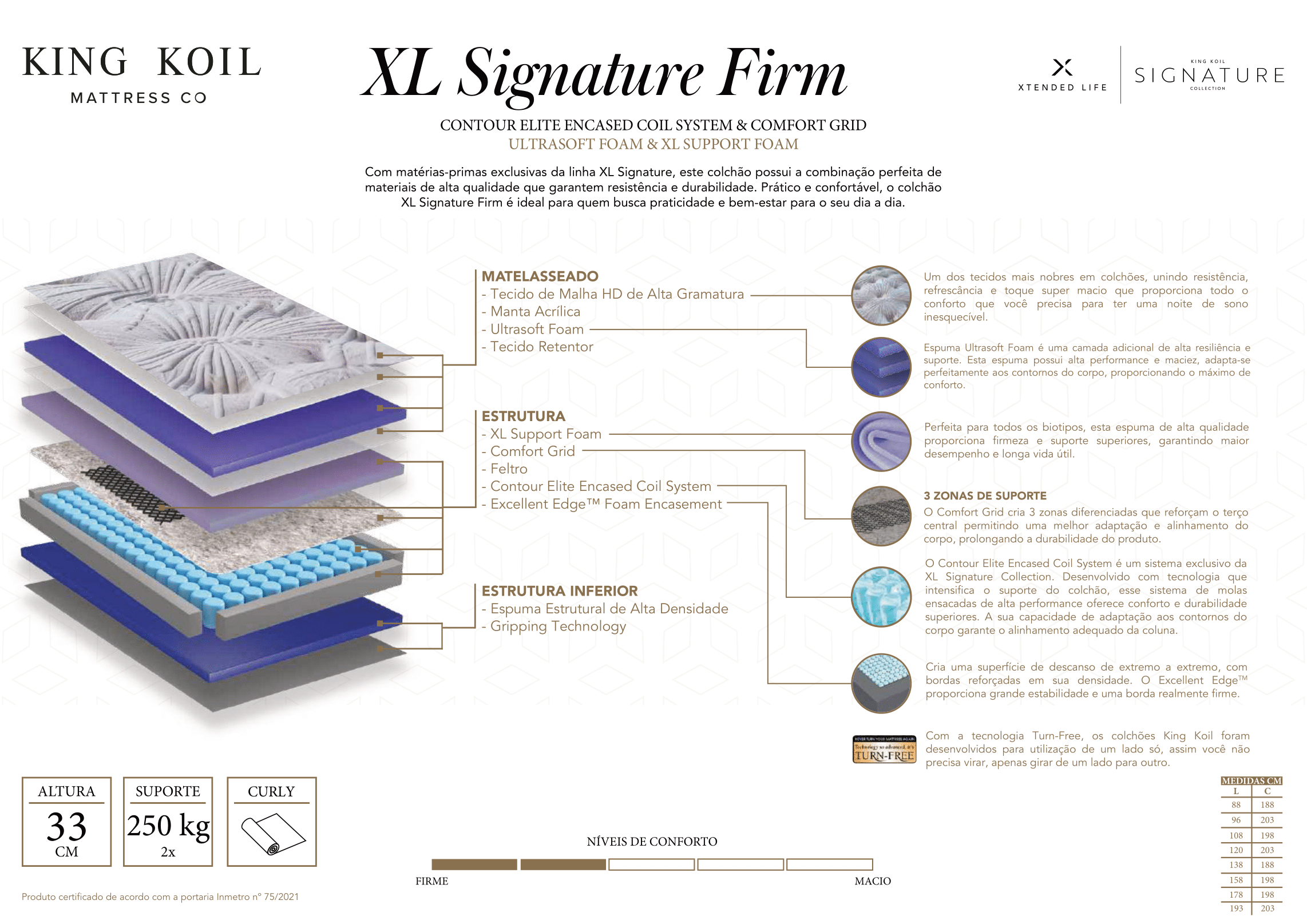 Com uma altura de 33 cm, o Colchão XL Signature Firm oferece uma presença imponente e um suporte excepcional de até 250 kg por pessoa. Essa capacidade superior de suporte o torna a escolha ideal para indivíduos que necessitam de máxima resistência, durabilidade e estabilidade.